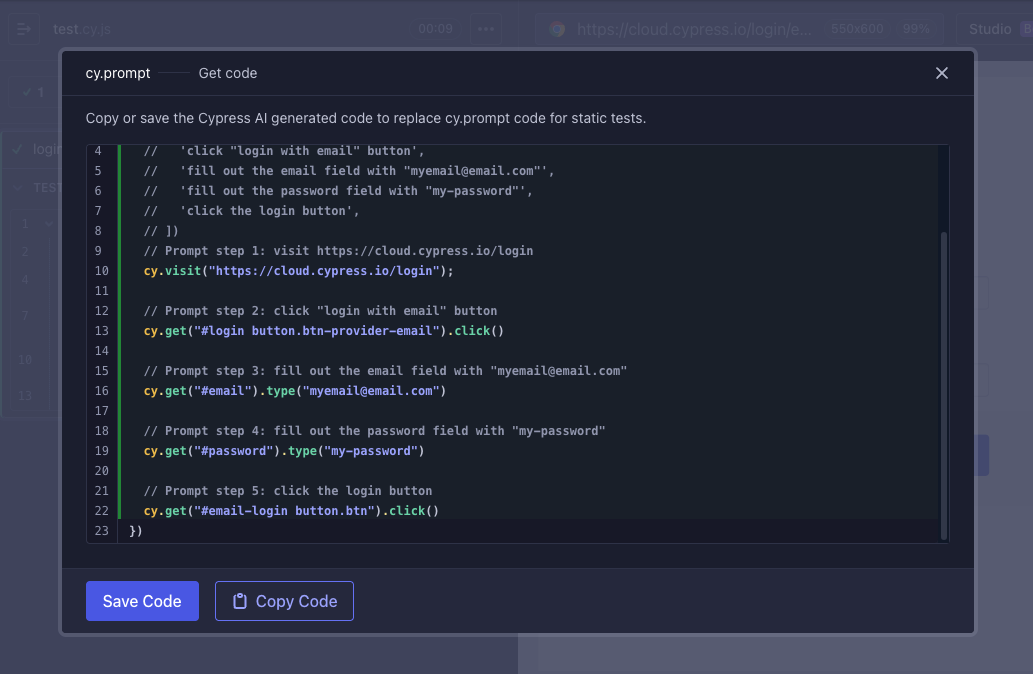 If you want the speed of natural language test creation without relying on AI during every run, you can use cy.prompt as a one time authoring tool. Run a prompt locally, review how it performs, then open the Code view from the Cypress Command Log to see the generated Cypress commands. From there you can edit them, save them, and commit the final test code to your repository.