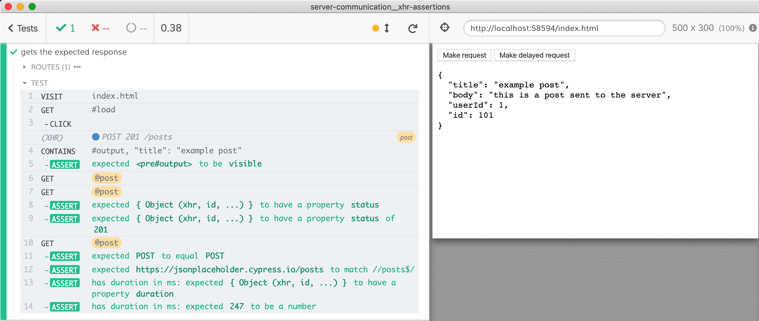 For example, the web application makes the same XHR request after a 1 second delay. The next test demonstrates how to skip the user interface and wait for the network call, and then assert its properties.