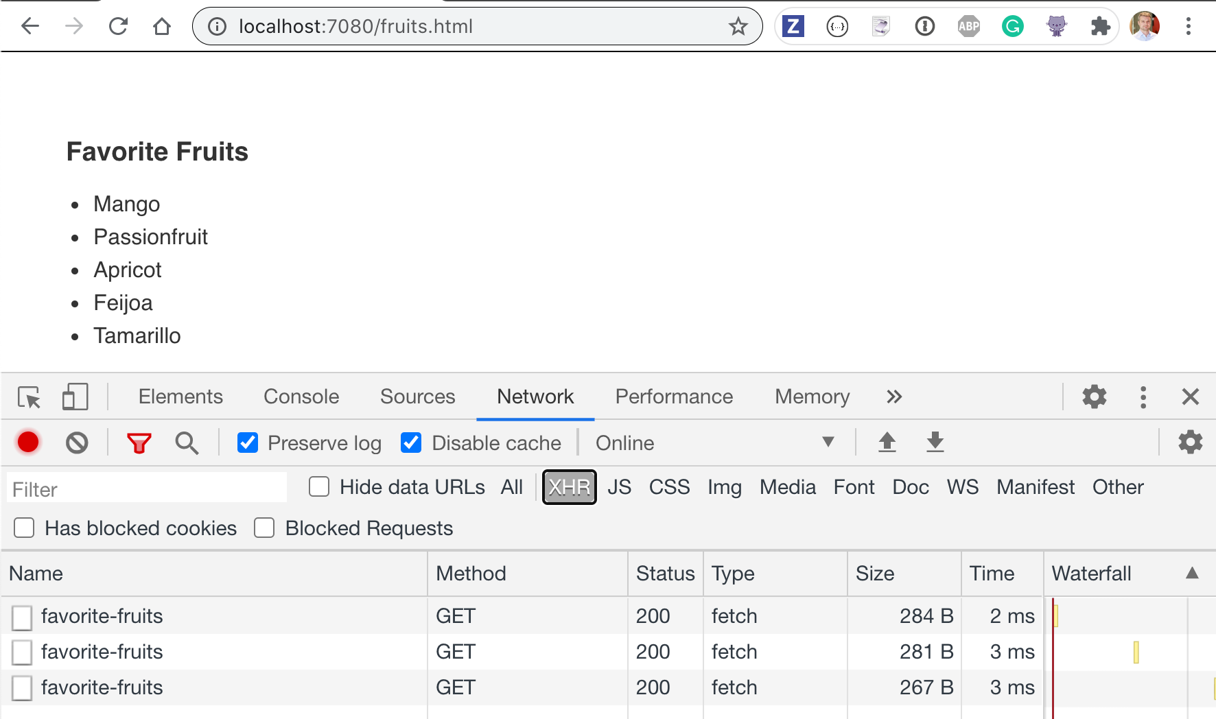 Our example application fetches a list of fruits to display. It fetches them at startup and it fetches the list of fruits every 30 seconds after that.