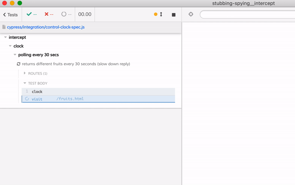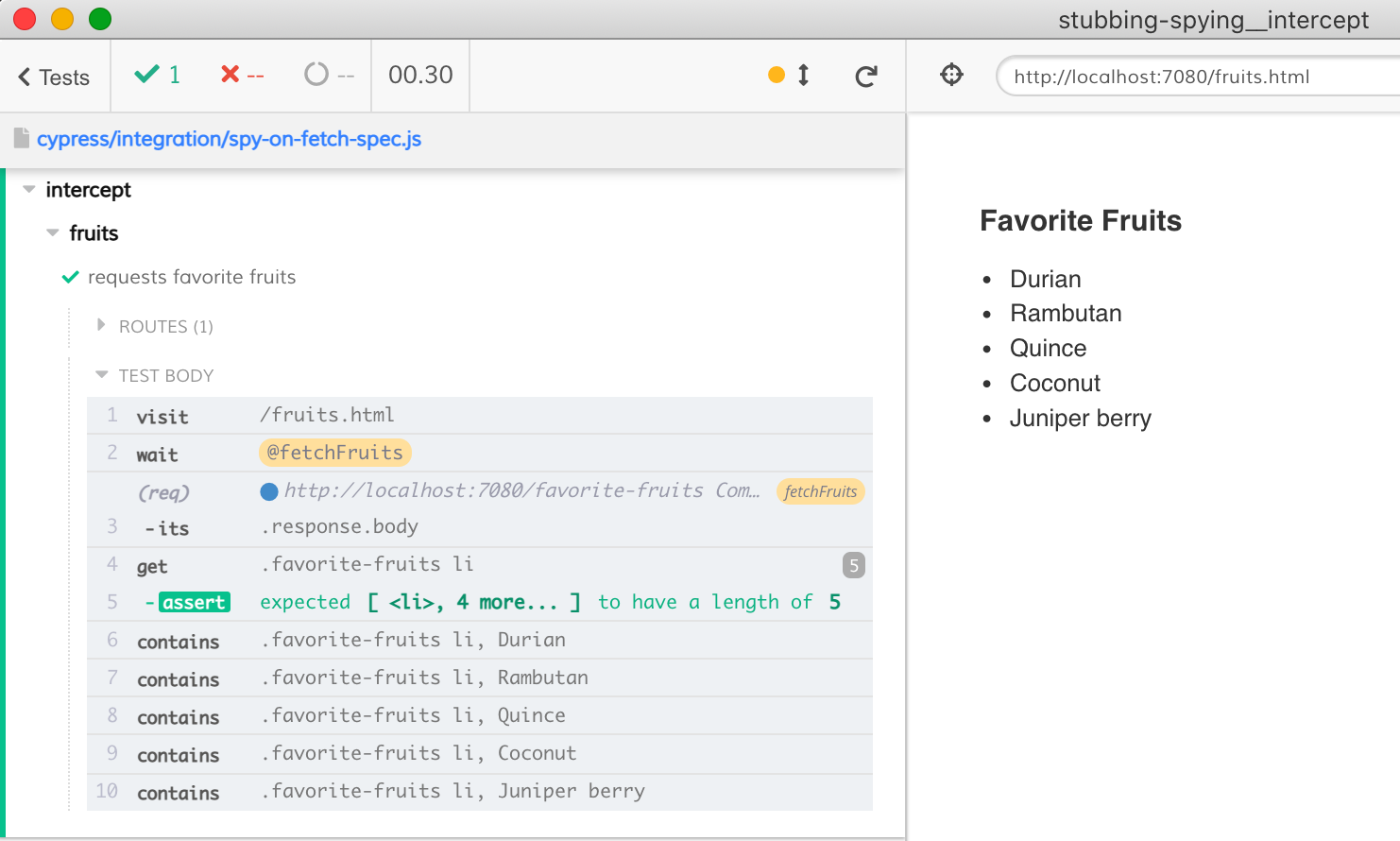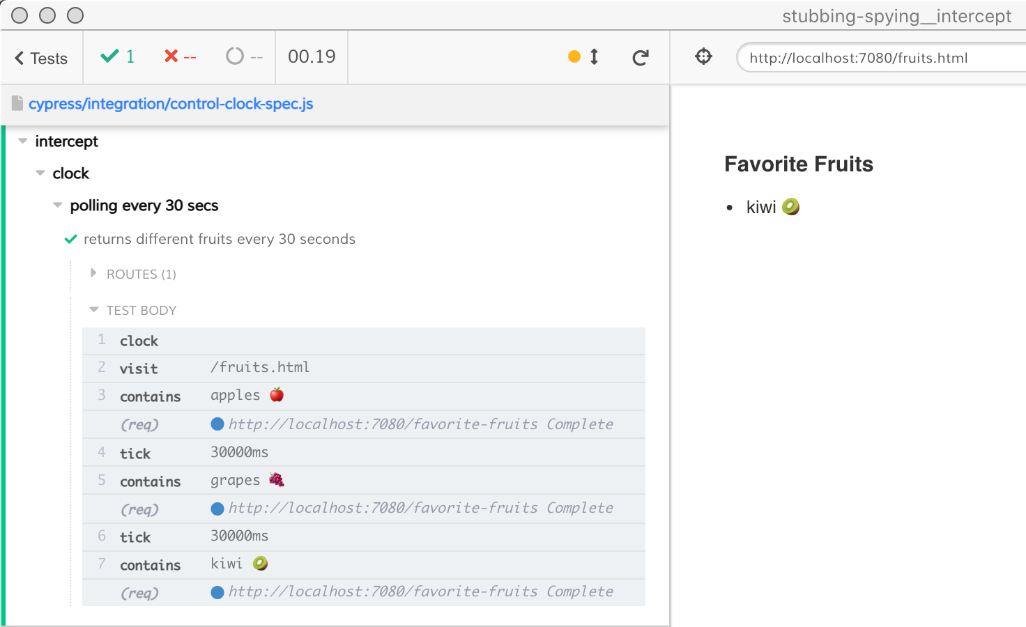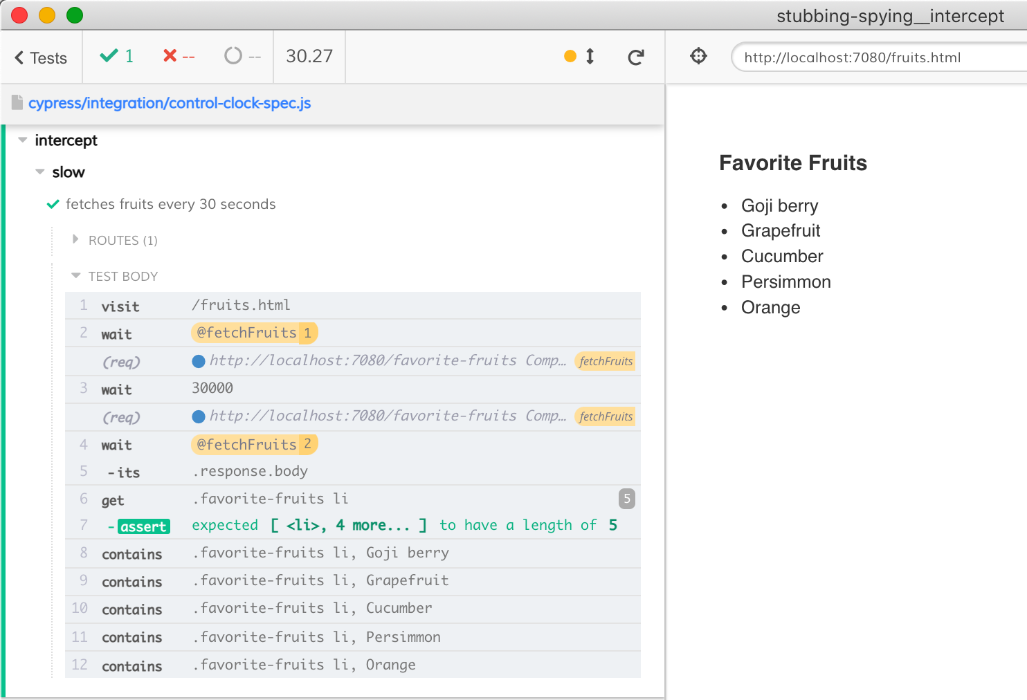 })The test "fast-forwards" 30 second intervals using the cy.tick(30000) command, checking the intercept's status code. On the last 5th request, we grab the response and confirm the last list of fruits is shown on the page.