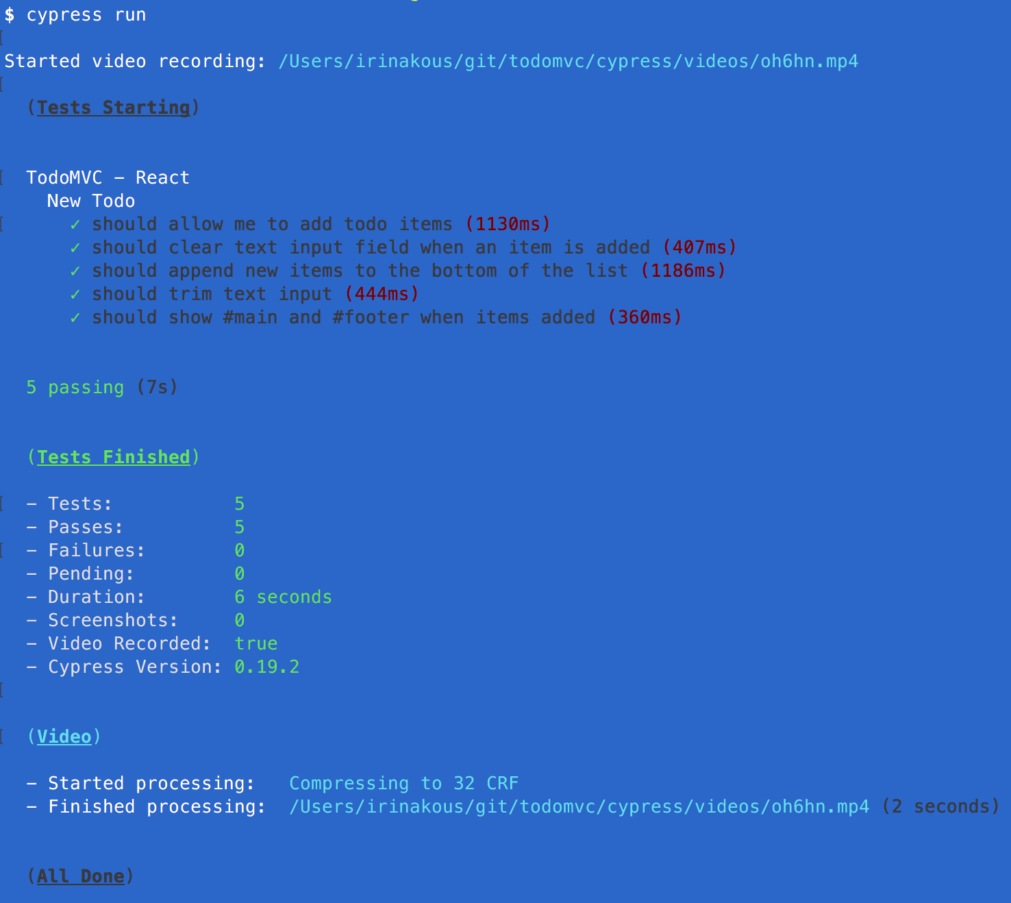 Seeing the UI update during the test is a powerful drug 😉, but we can run Cypress without the UI too. Assuming the TodoMVC application server is running we can just call cypress run to execute end to end tests.