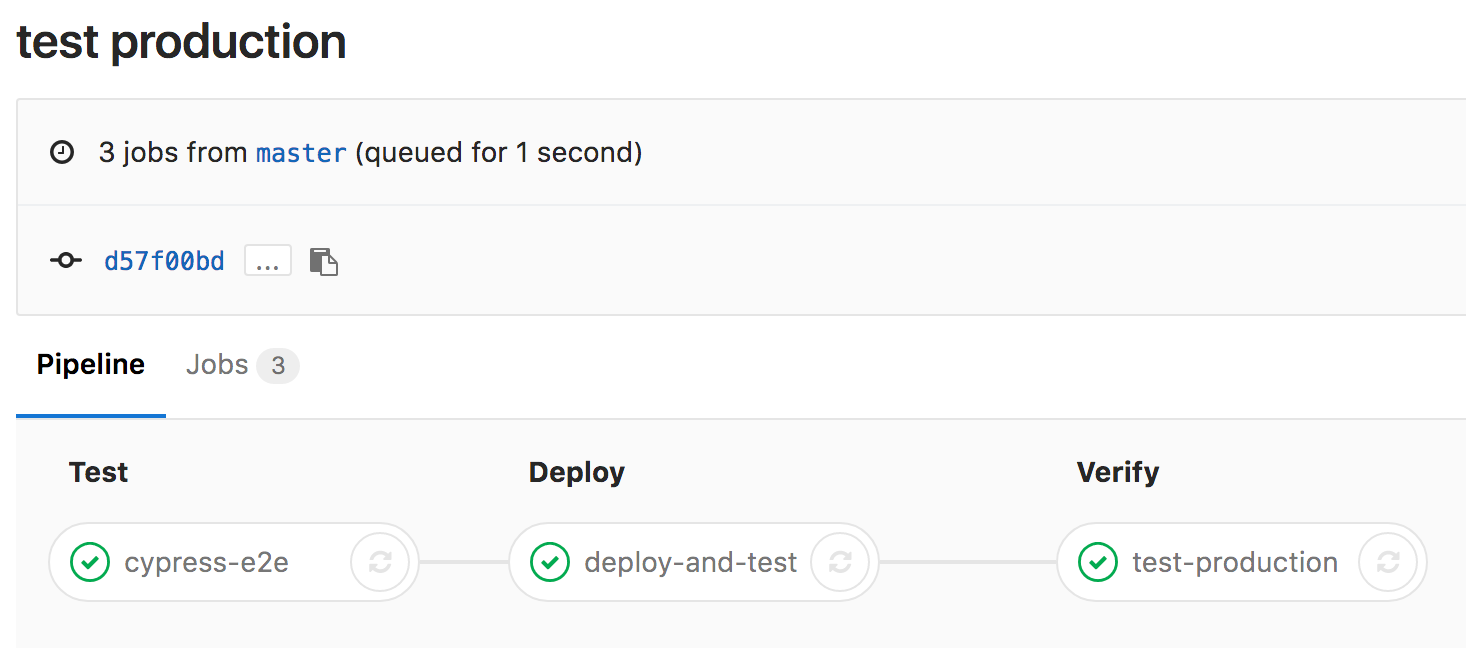 Finally, we can verify that the application is still working after changing the DNS record. Who knows, maybe we had some hard-coded URLs or domain white lists? Just run Cypress tests against the production URL! By now you know how to do this; we have been using the one and only cypress run command every time, and just gave it different base urls. I will run the test-production job during verify stage which executes after deploy stage, because that is the order I listed them in the “stages” list, you can see the complete .gitlab-ci.yml file for reference.