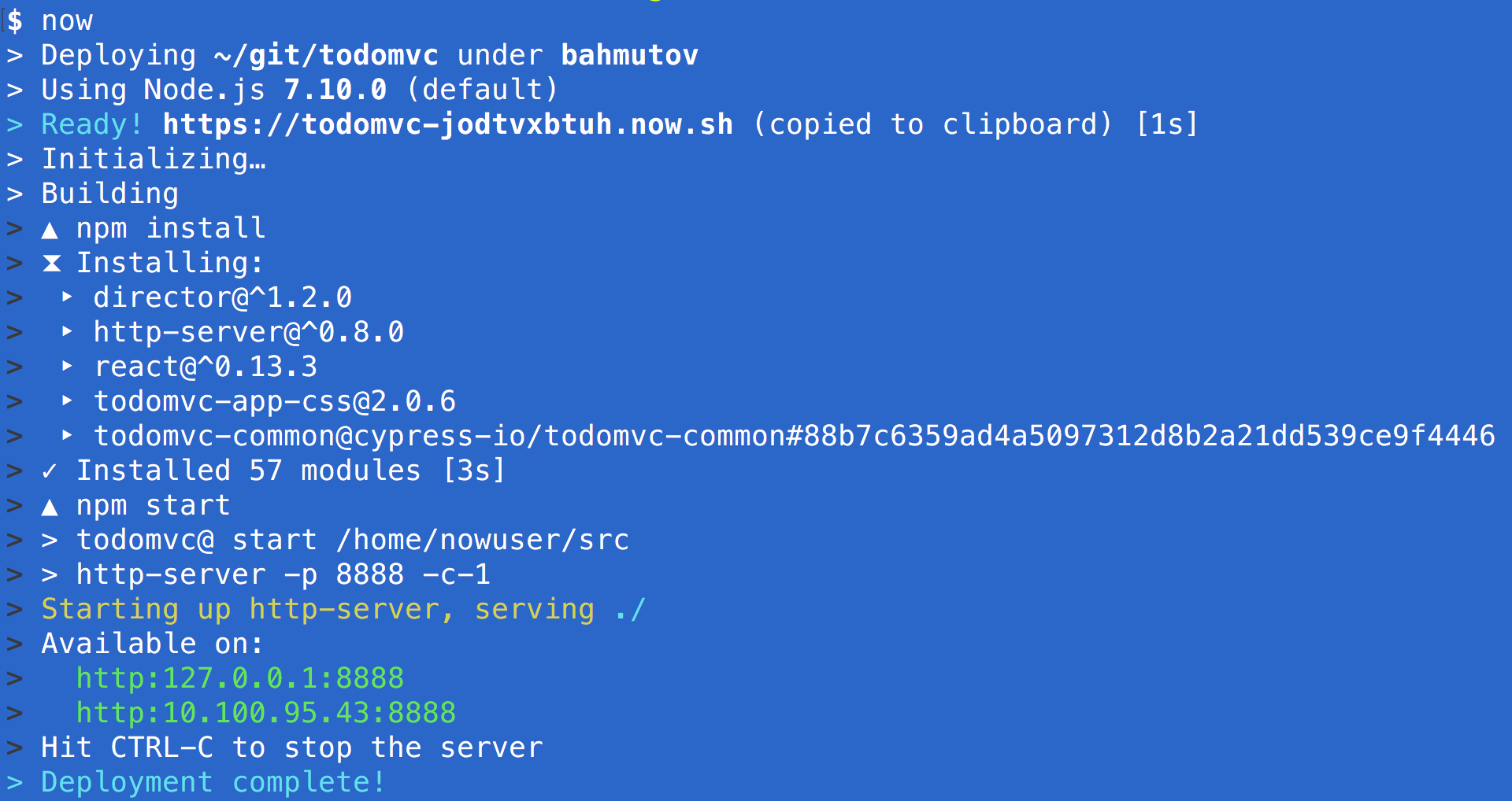 Running TodoMVC server locally is nice, but we want to share it with the world. The simplest way to do this that I know of is to serve it via Zeit.co now tool. For example, from the local terminal, I can just invoke now and get my server up and running!