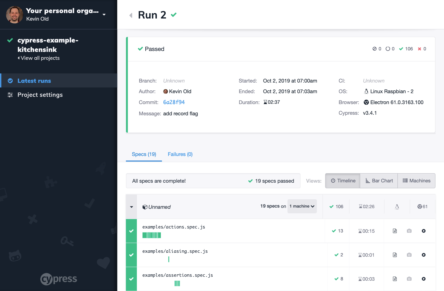 The Cypress Dashboard provides additional value around parallelization, grouping, detailed insights into the performance of individual tests and specs, and Github Integration.