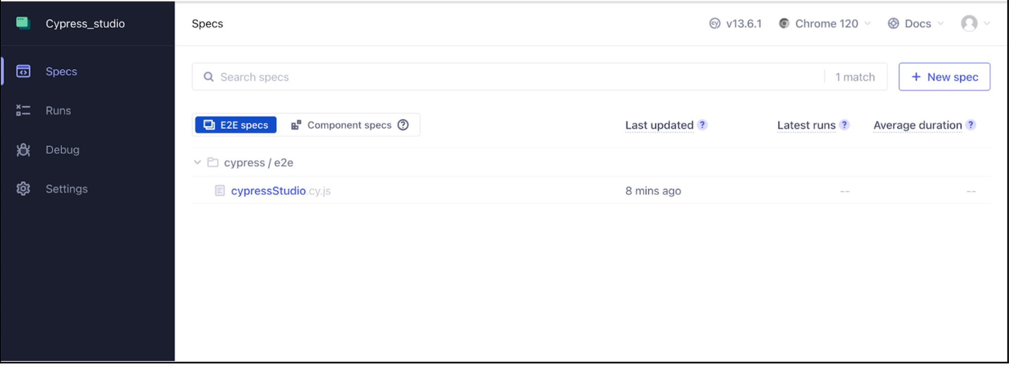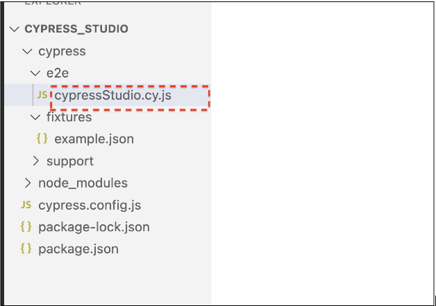 To eliminate any confusion, we’ve cleared out all pre-existing pre-defined test cases from the e2e folder. Now let's create a new spec file, e.g., cypressStudio.cy.js.