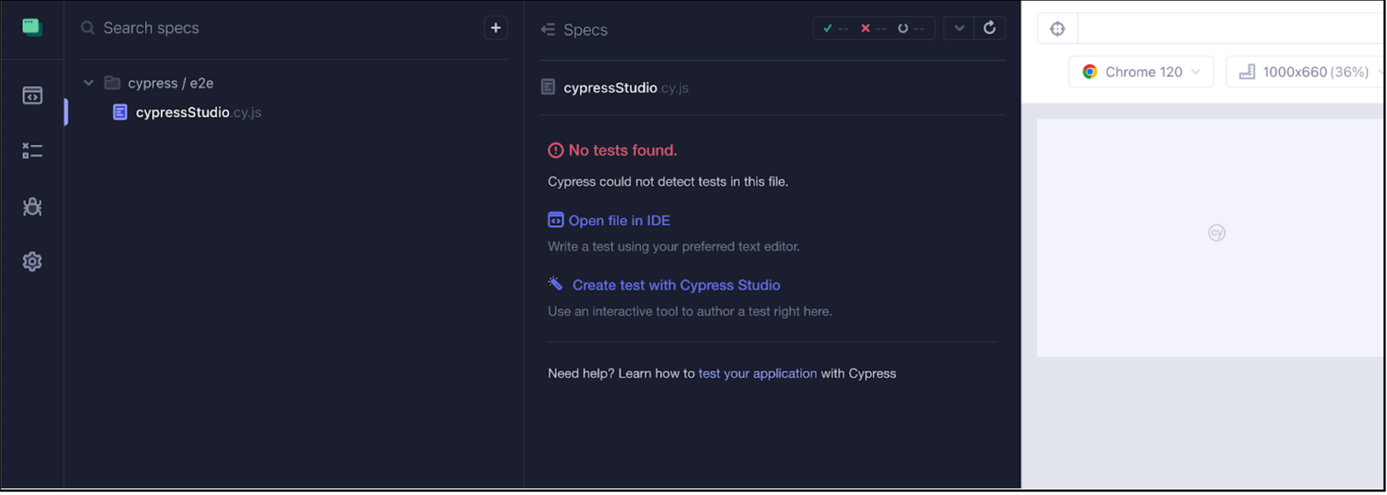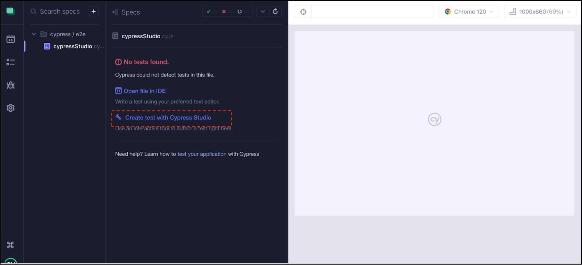 Select the .spec file from the screen above, the message "No tests found" appears along with a link to 'Create test with Cypress Studio.'