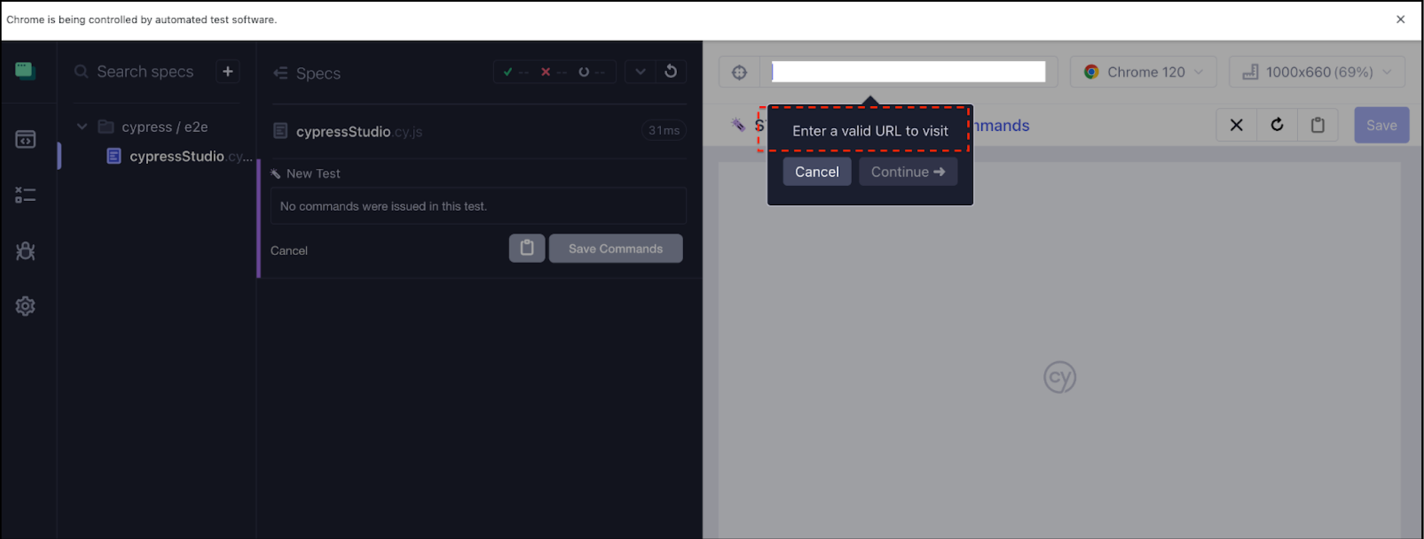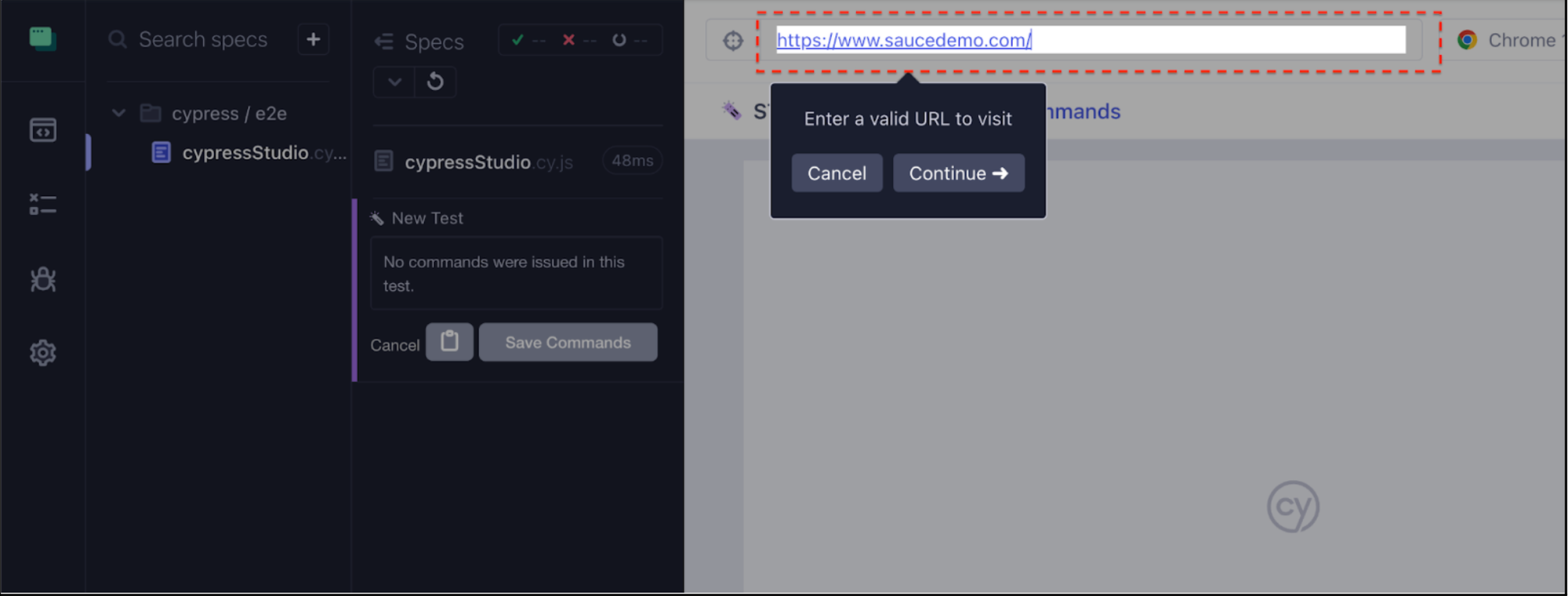 Select 'Create test with Cypress Studio.' Upon clicking this link, it will prompt you to enter the URL.