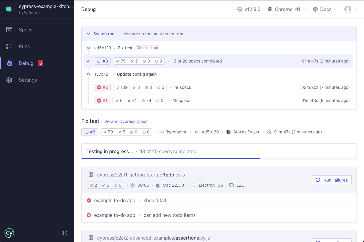 With the release of Cypress 12.9, we’re improving our new Debug page by allowing users to navigate between test runs, which will be surfaced and persisted.