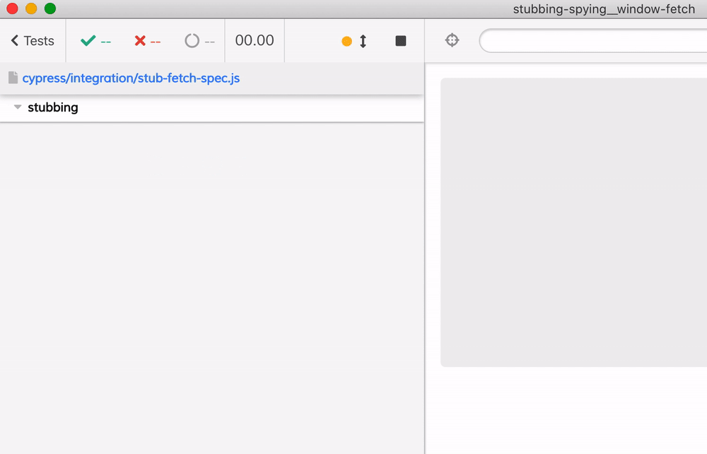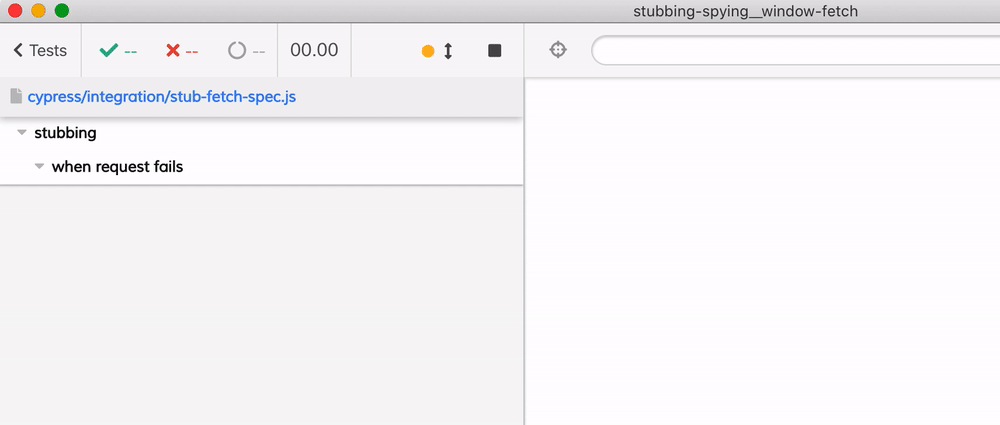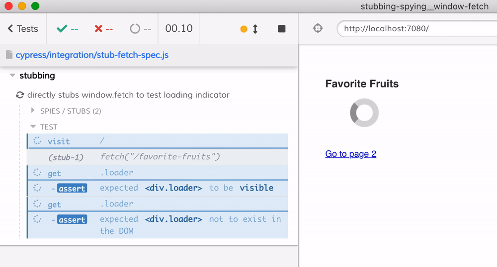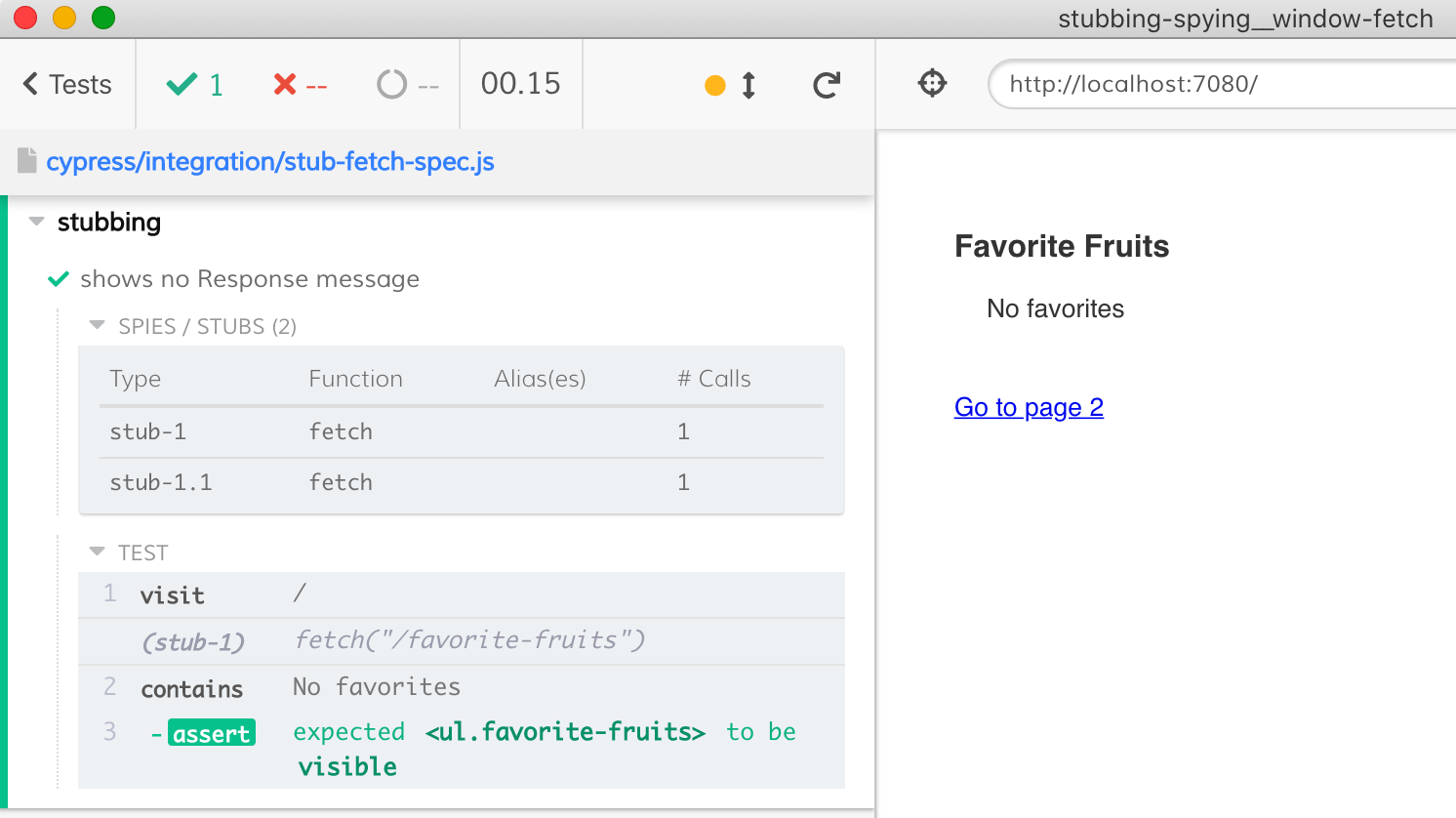 })The test passes, and we see the stub in the Command Log - the two records are due to the fact that we have created first a general method stub window.fetch and then made created an explicit one with cy.stub(win, 'fetch').withArgs('/favorite-fruits'). I think is a good practice to create targeted stubs by giving argument values or types.