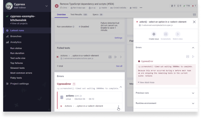 With this update, you can now expand error details and view the exact line of code in your test spec file that led to the failure, browser screenshots and videos of your application's failure state, and the historical performance of the failed test. All directly from the Run Overview page.