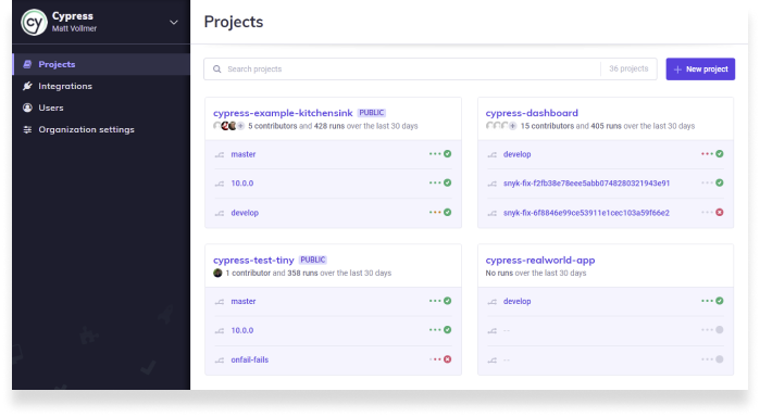 The new Projects page in Cypress Dashboard now displays your organization’s projects with shortcuts to relevant branches and their most recent test runs.
