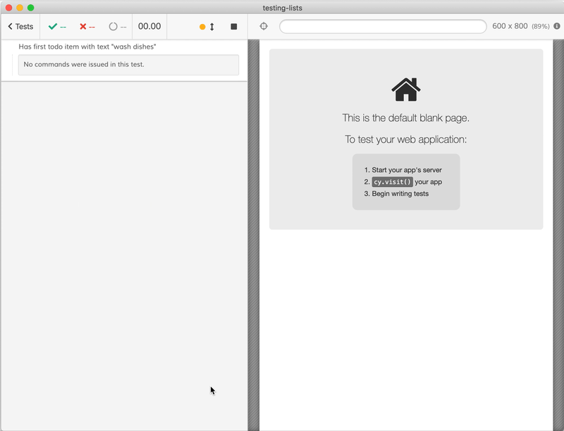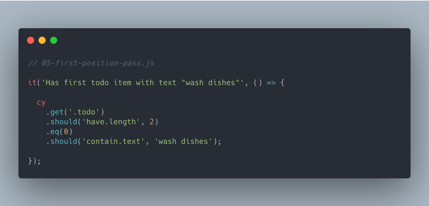 We can start by testing a list with two items. In a situation where we test a couple of items, the testing flow can be pretty straightforward. In our first test, we use .get() to select our todo items and then .eq() to filter the item we want to work with. Code looks something like this: