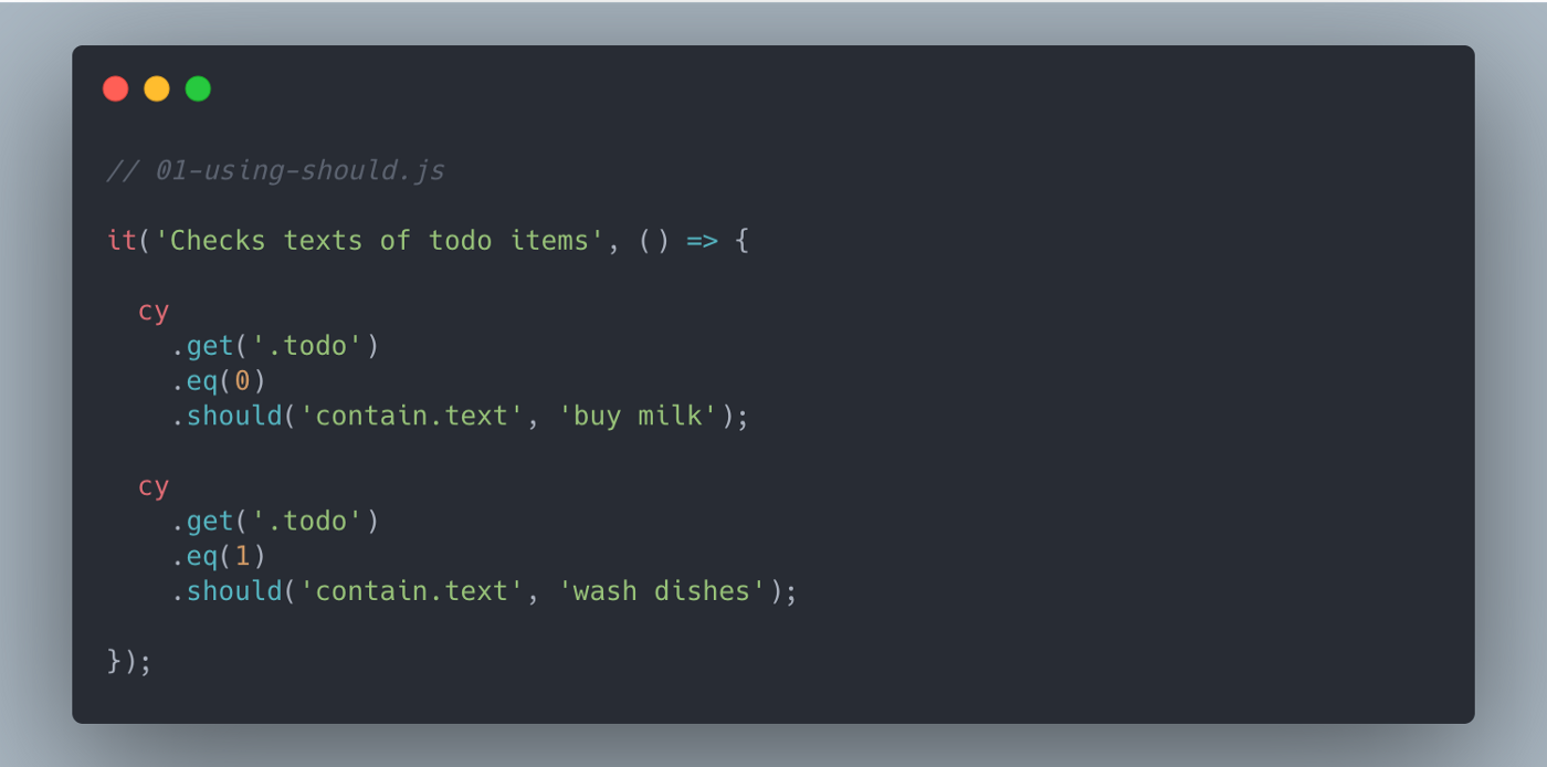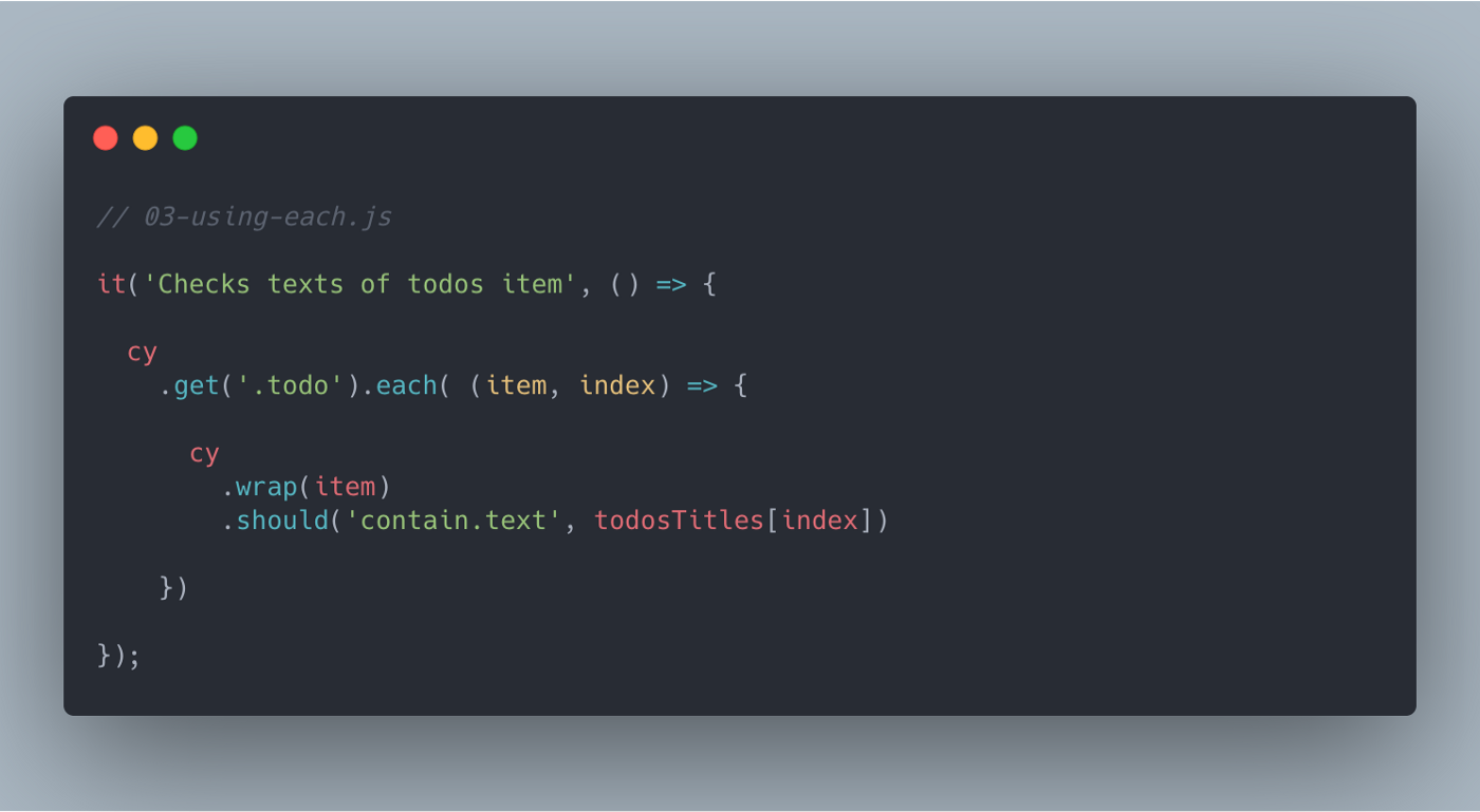 While this approach is nice, we might get into a situation where want to test longer lists. With 10 or more items, our code might get repetitive. So instead, we can select our todo items, and then use .each() command. This command works very similarly to a array.forEach() function and it enables us to work with items that are yielded via .get() command.