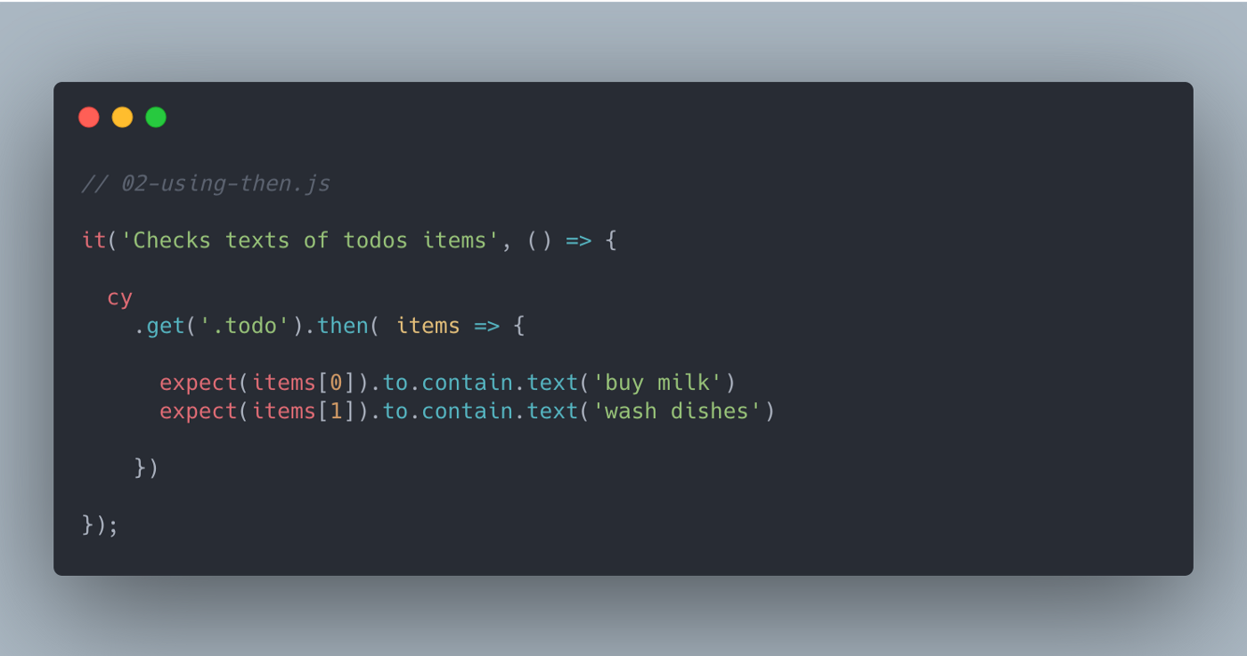 We can make this code more compact. Instead of selecting each element individually, we can select them both and make a single assertion using .then(). When .get() command finds multiple elements it returns an array. This means we can reference each item as we would in an array, using items[i] where i is the index number.