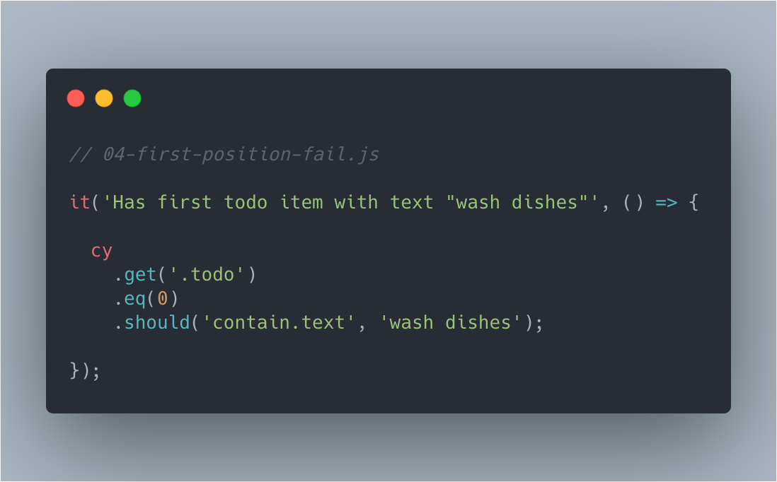 Here we have a test, that should have an item with the text „wash dishes“ on a first position. Our test starts with the item on second position, and during the test, we delete the first item.