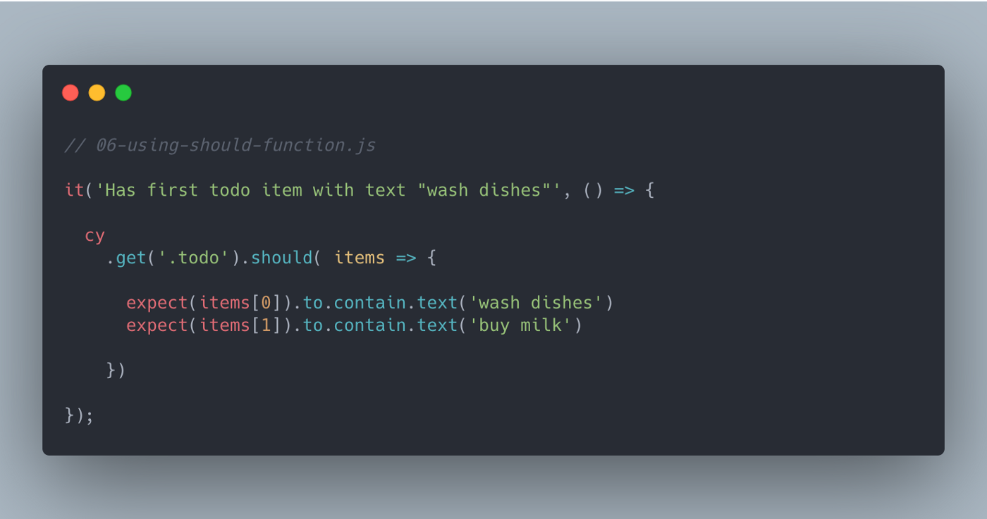This solution is not really satisfying, is it? We may be facing a situation where the number of our items does not change, but only the order of our items changes. Because we can use drag and drop in our app 😎. In that case, we can use .should() command and pass a function into it. There are many cool examples in the documentation on this. The final code looks very similar to when we are using .then(). The main difference is, that .should() commands uses retries logic, but .then() not use retry.