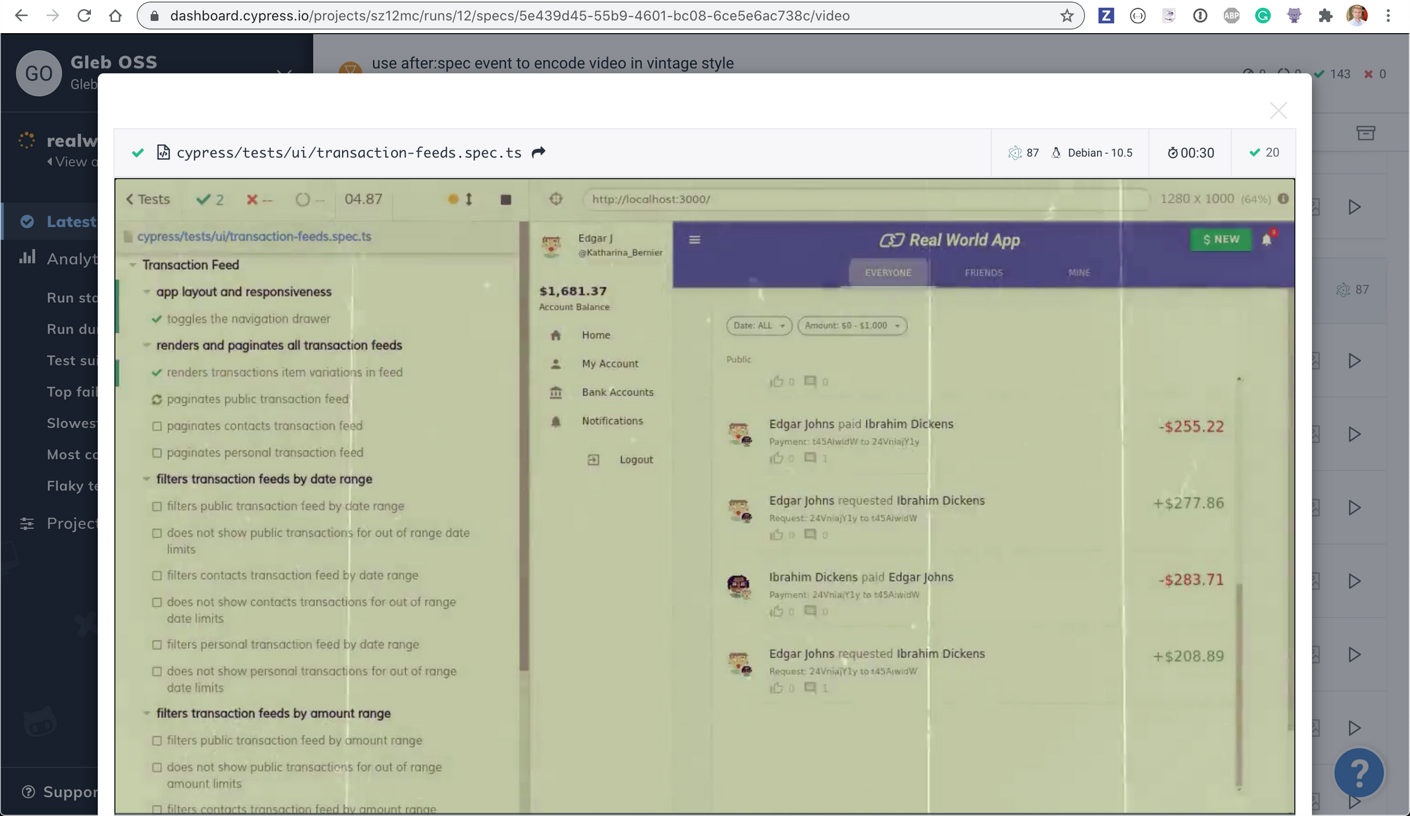 In this blog post I will show a fun application of the after:spec hook. We will re-encode the spec's video to look like a vintage movie reel. In general I will follow the video processing advice described in this blog post with a few small changes. You can find the finished result in the pull request bahmutov/cypress-realworld-app/pull/14. Here is a typical spec video 😆