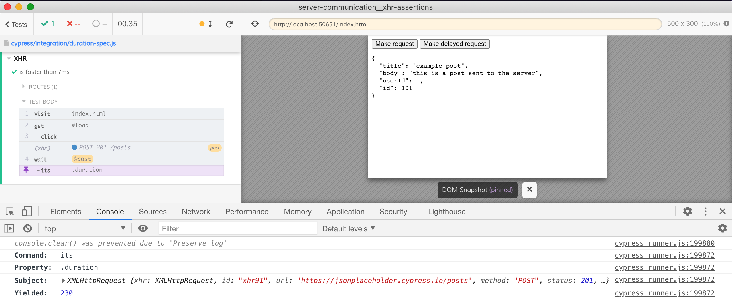 })We have the Ajax call's duration cy.wait('@post').its('duration') but what should the assertion compare the returned value to? Let's run the test and click on the Command Log to print the value in the DevTools' console.