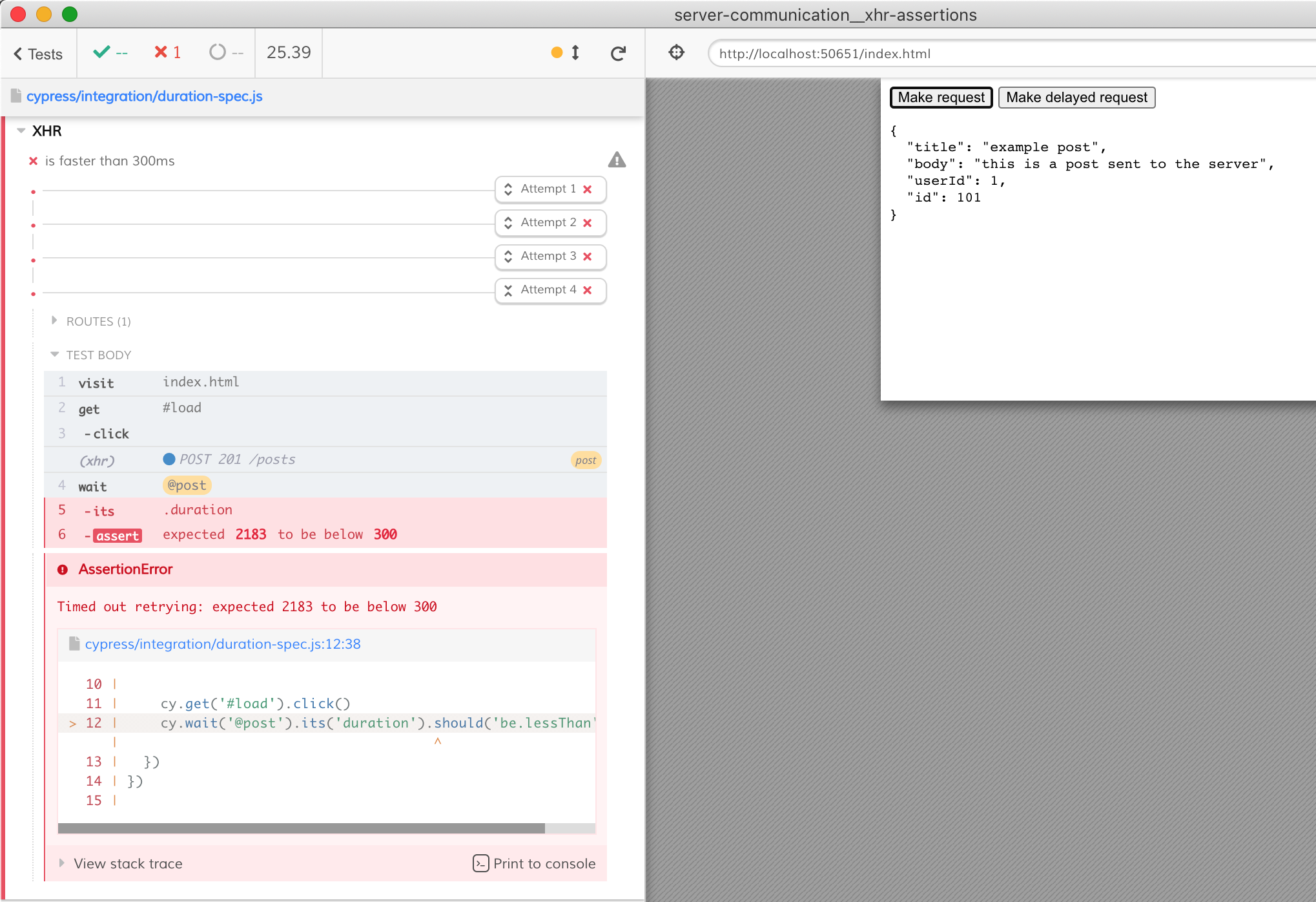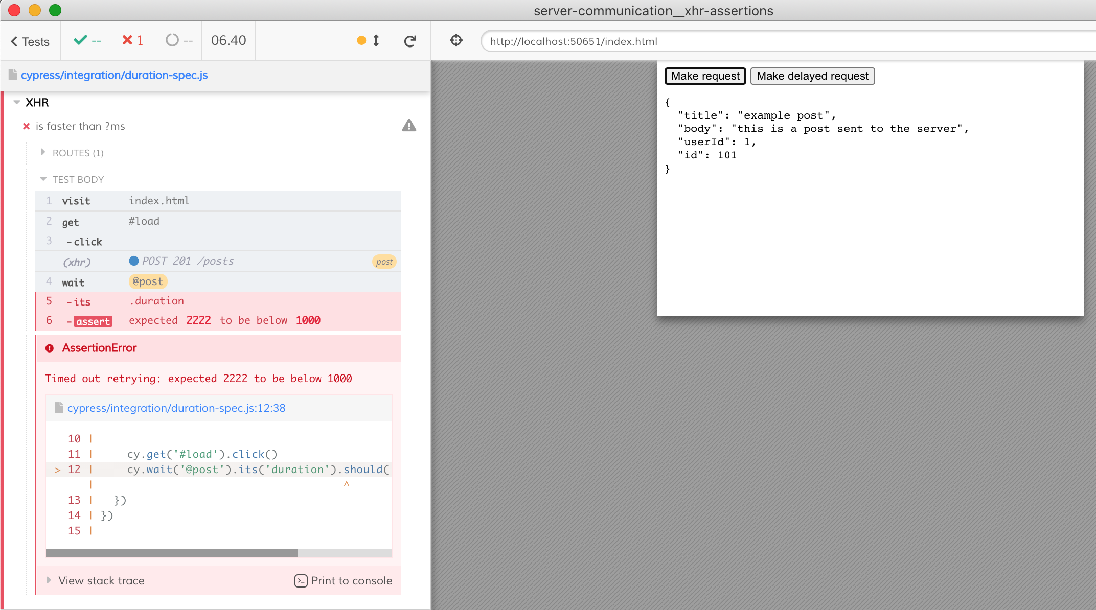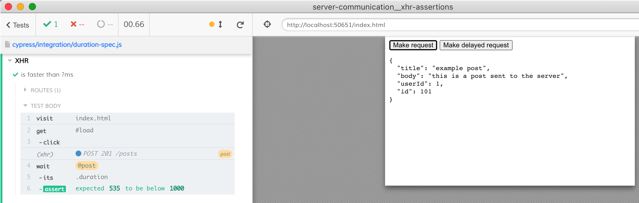 cy.wait('@post').its('duration').should('be.lessThan', 1000)It certainly passes