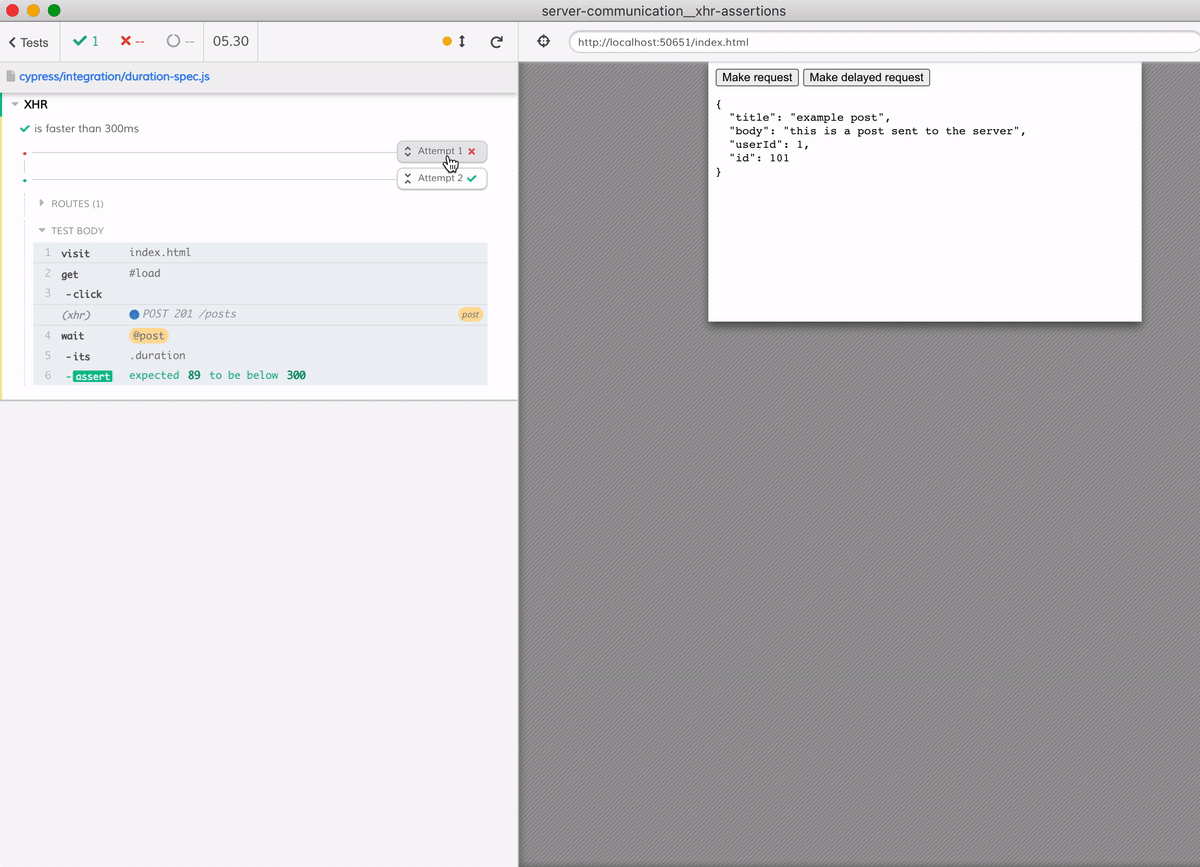})Most of the times pass on the first attempt. And if it fails, then it re-runs the entire test and (hopefully) passes. You can see this case happening in the GIF below. The first test attempt failed, because the server took almost 900ms to respond, but the second test attempt is green, because the server responded in just 89ms.