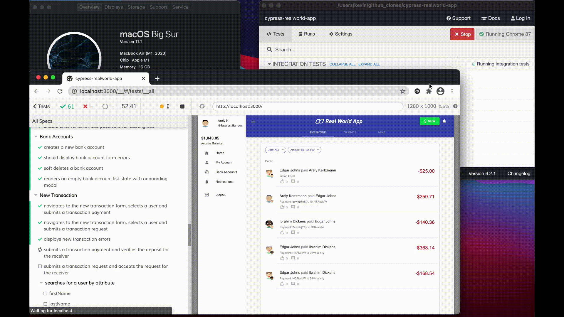 We can clone it, run yarn install, yarn dev and finally yarn cypress open to see our Cypress tests running on the M1 under Rosetta 2 using the x64 Node.js we installed earlier.