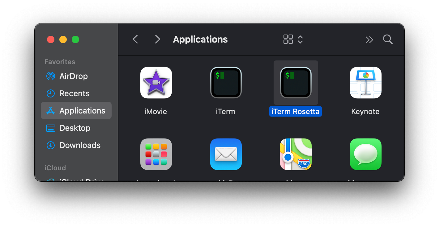 - In the Applications folder, copy Terminal/iTerm and rename it to Terminal/iTerm Rosetta.
