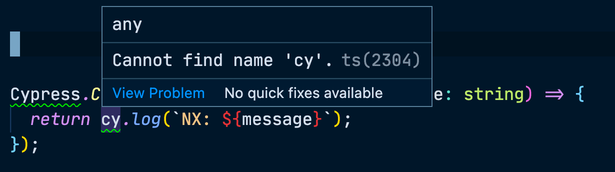 You may notice that TypeScript does not recognize Cypress’ global cy object in our generated cypress-commands library.