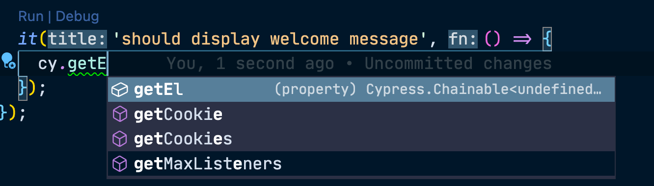 Note how the TypeScript autocomplete support is picked up properly and shows our custom Cypress command: