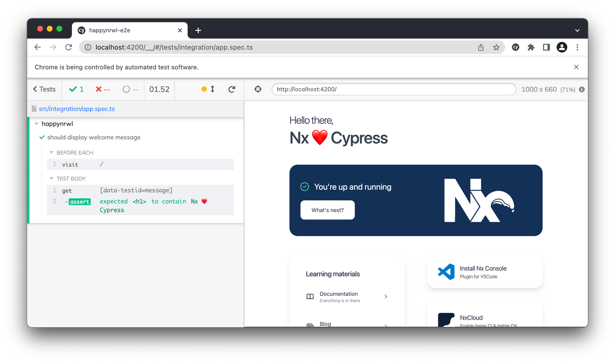 Next, in the corresponding e2e test in apps/happynrwl-e2e/src/integration/app.spec.ts we change it to the following: