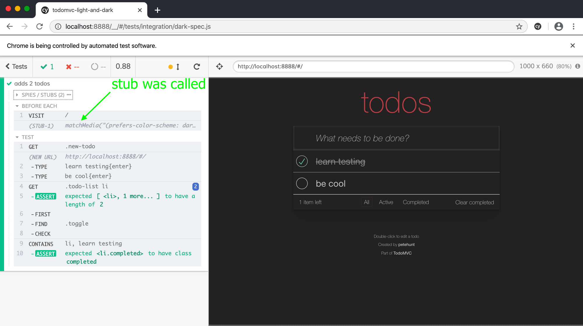 The test passes, and we can see in the Command Log that the matchMedia stub was really called.