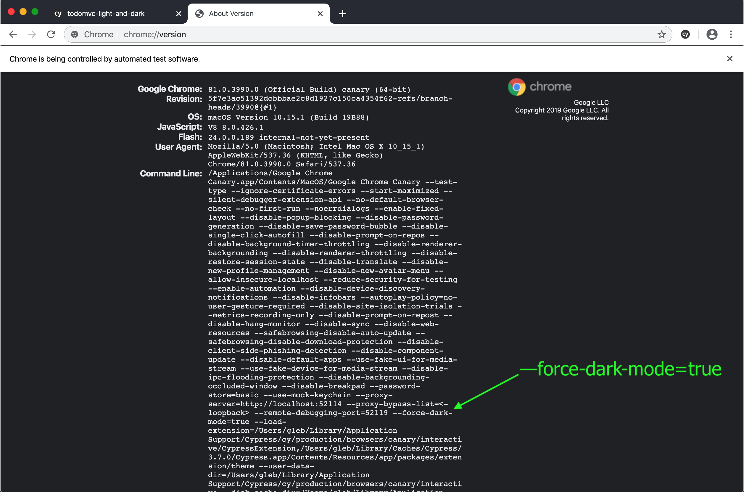 Here is the test in action - with our plugins file forcing Chrome to use Dark appearance styles.