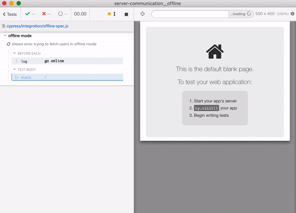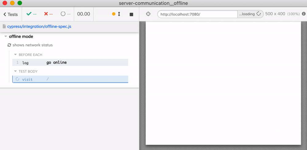 While Cypress is running, it needs to communicate with the browser. Thus, the browser cannot be offline forever—it needs to communicate the status of every test back to the Cypress Electron App. So we need to make sure to enable network back again at the end of every test.