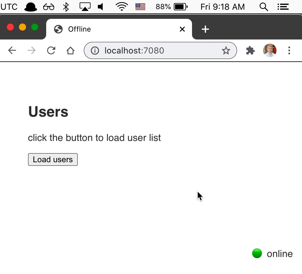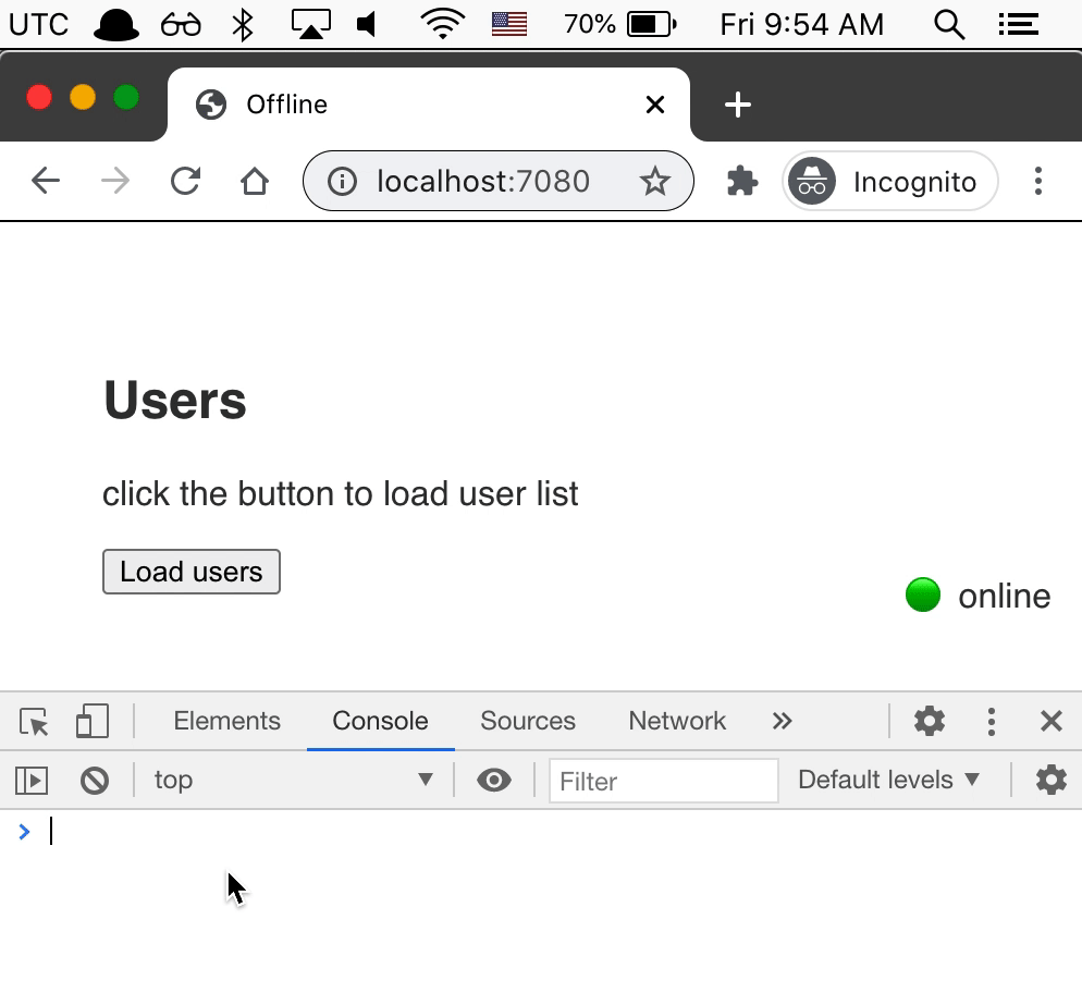 We can simulate the offline network mode right from the browser. For example, in Chrome we can open the DevTools, click Command + Shift + P to open the command palette and execute the "Go offline" command to switch the browser to offline mode. The application behaves the same way as when turning the laptop's WiFi off.