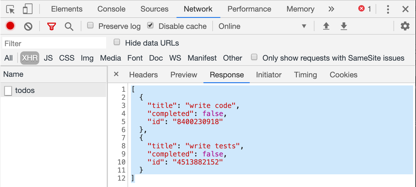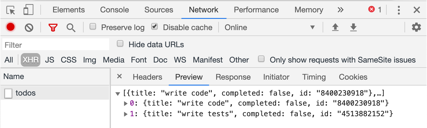 Let's test this. First, we need to know how our application gets the initial list of todos. The DevTools Network panel shows a call to GET /todos the application performs on load. This is how the front-end is loading the initial list of items from the database.