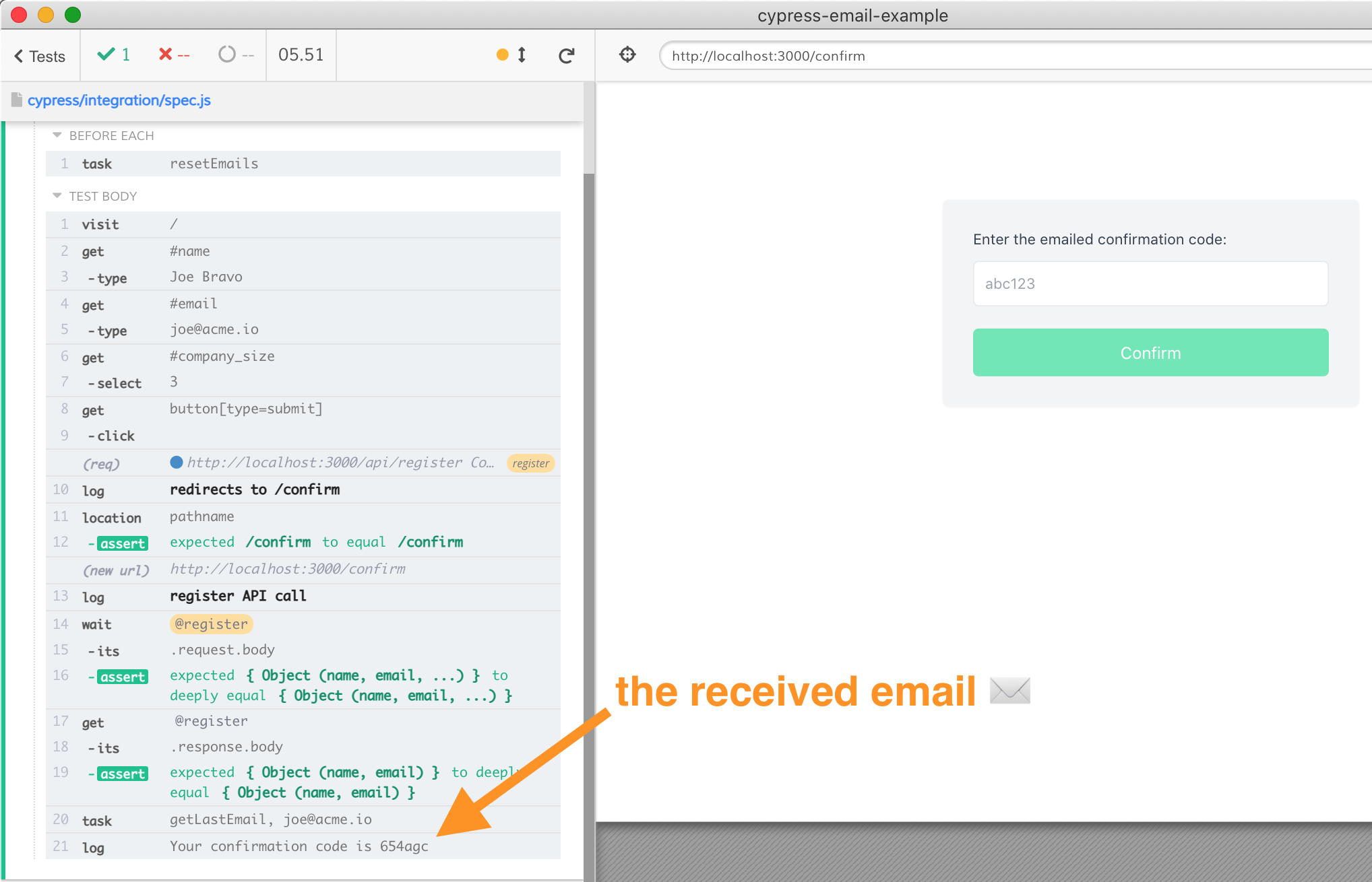 })By wrapping the value yielded from the cy.task using the cy.wrap, we print the value to the Command Log without using an extra cy.log command. The entire test shows that our application is emailing the confirmation code that works.