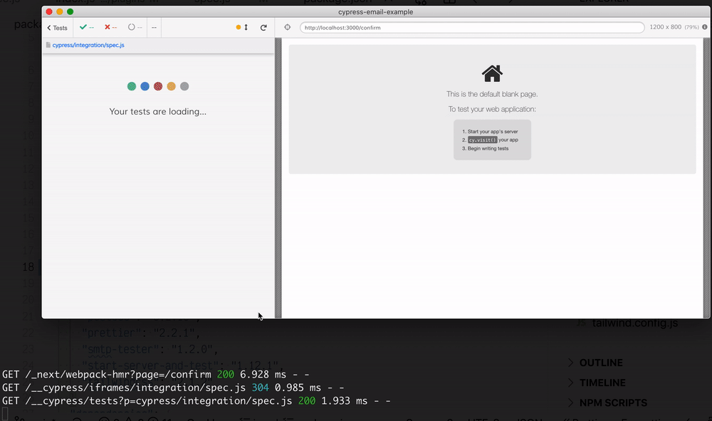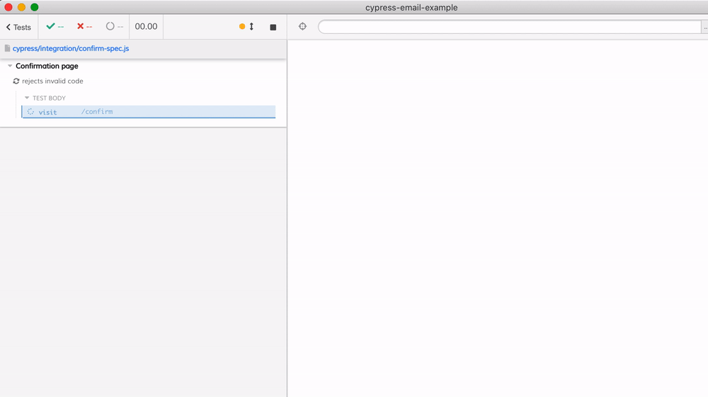 You can see from the terminal messages that the SMTP server running inside the Cypress plugin process receives the registration email with the confirmation code. Let's get this email text and use it to continue our test - we need to enter this code on the confirmation page. We can store the last email's text for each user in an object inside the plugin file: