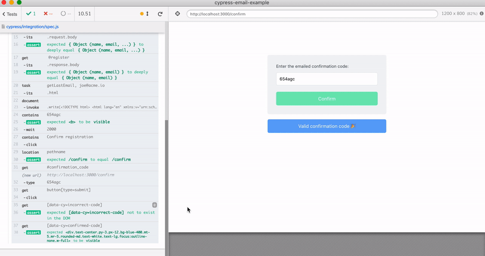 My favorite part about the above test is the time-traveling debugging experience. I can see the received email, the confirmation code it contains, the link clicked - just by hovering over the test commands.