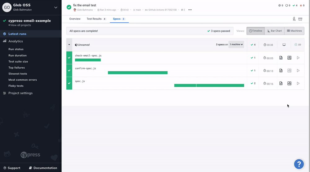 Tip: we assumed the server has received the expected email by the time we called cy.task('getLastEmail', '[email protected]'). Of course, due to the async nature of the application flow, it is not guaranteed. If the above test is flaky due to the delay in the email arrival, use cypress-recurse to retry the task command until the email arrives (or the test times out).