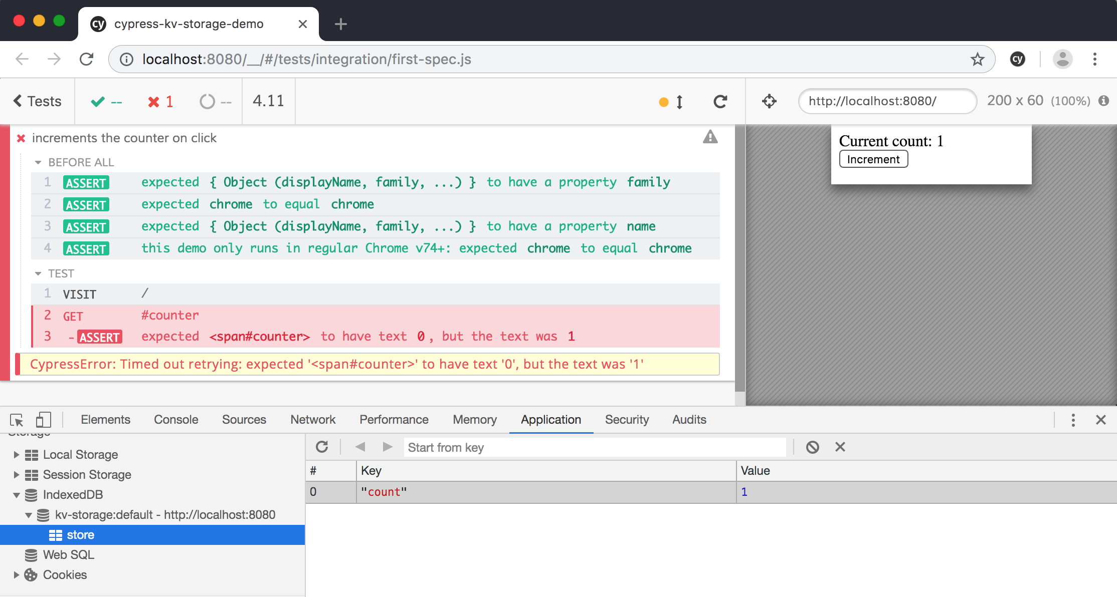 Everything is going great, except ... if I rerun the test - it fails. The std:kv-storage uses IndexedDB to actually save the values and it is NOT reset between the tests.
