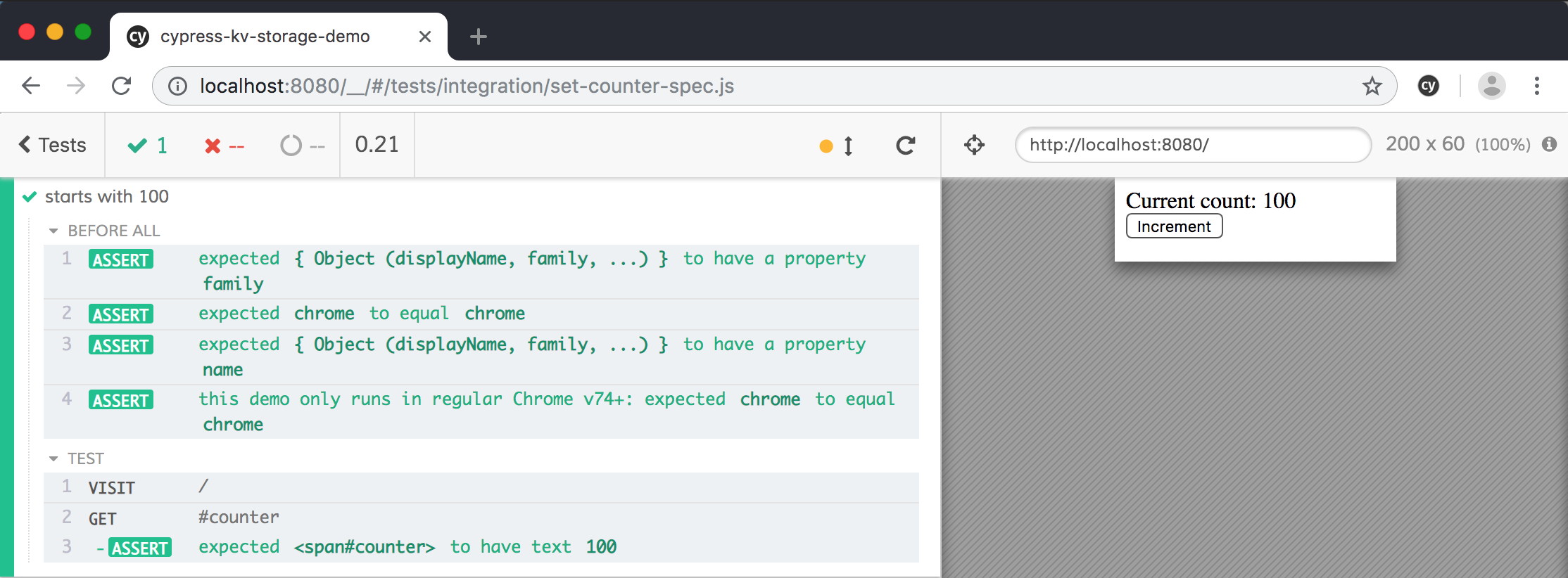 Cypress.storageand callsawait storage.get('count'). By this point thecounthas been set to100by the test code. - The value