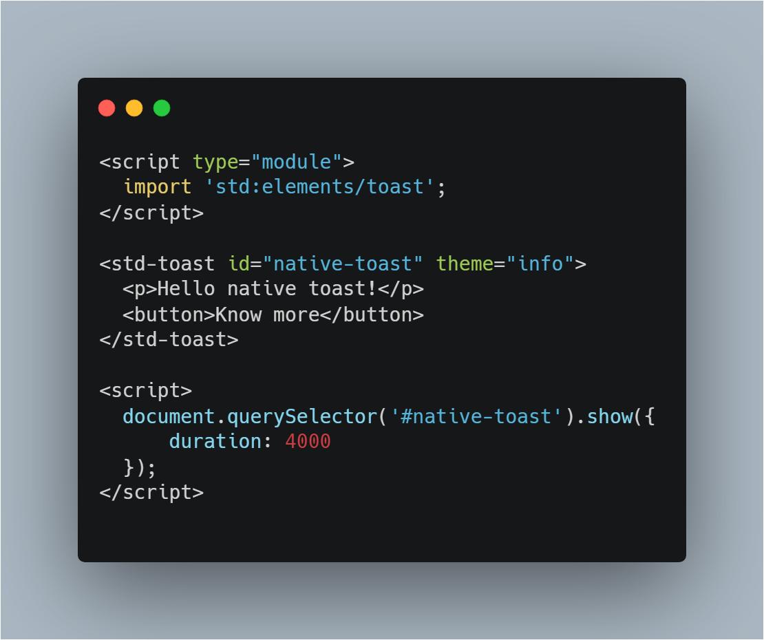 Notice the import at the top - the name of the module is special, it starts with an std: prefix. In the future more standard modules will be added; I am particularly excited about std:elements/toast component.