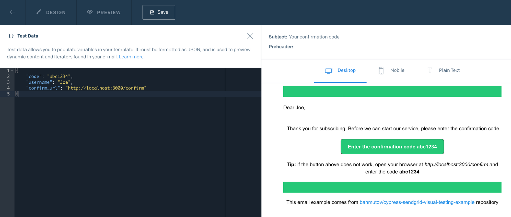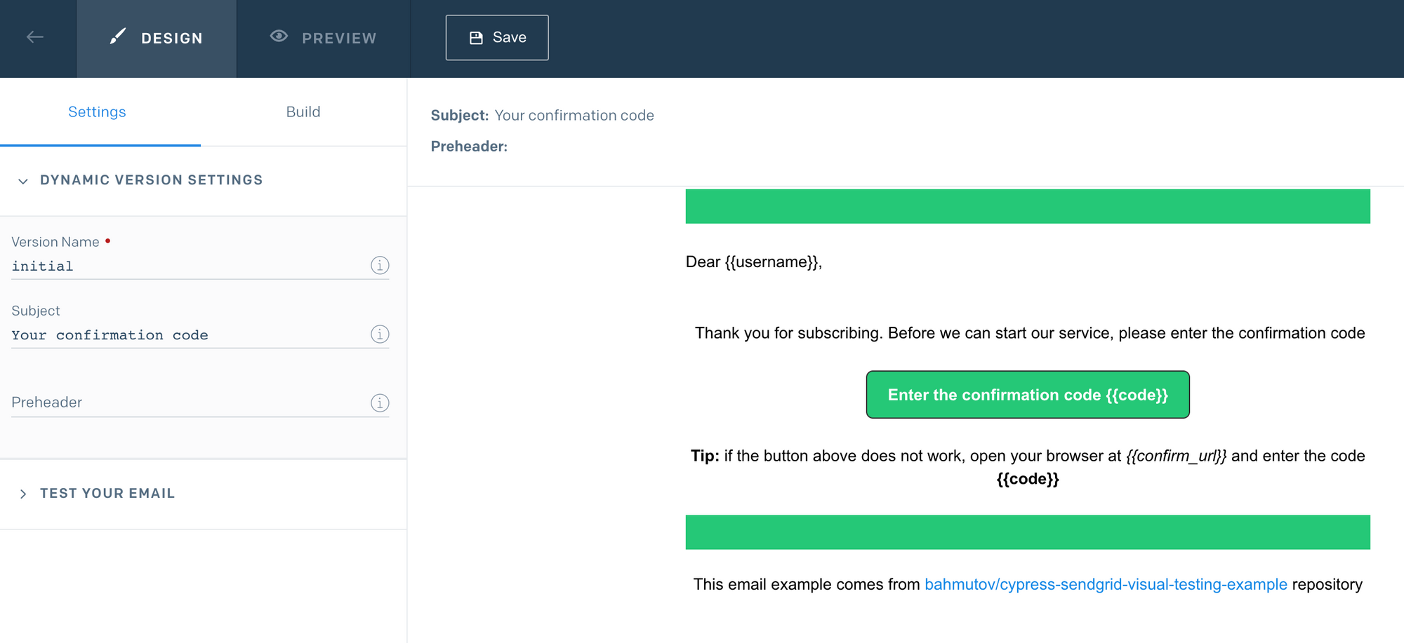 For example, I have designed the following "Confirmation code" email in SendGrid