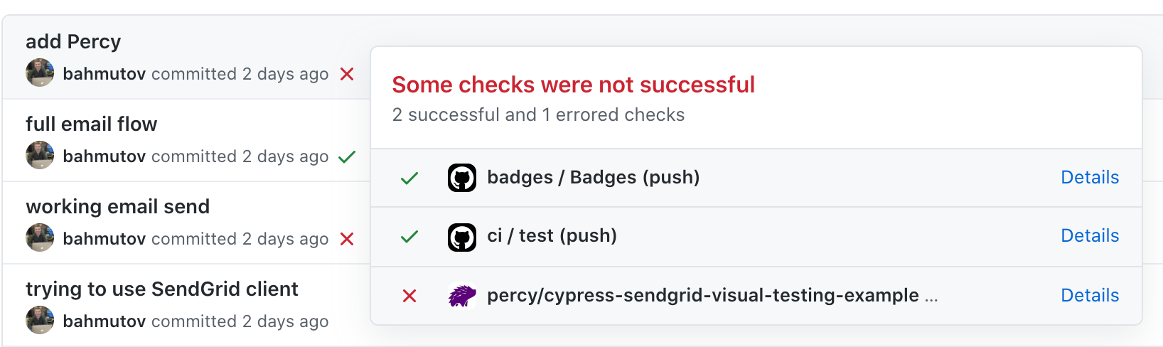 })Percy visual service runs asynchronously - it sends the DOM and CSS snapshots to its image rendering and comparing cloud, and then posts the status to GitHub. Thus we can have commits and pull requests where functional Cypress tests finish successfully, while visual Percy tests fail.
