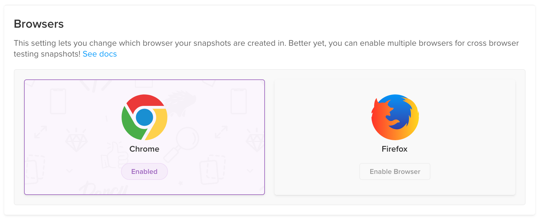 By default, Percy renders the DOM + CSS snapshot in both Chrome and Firefox browsers, and in two resolutions.