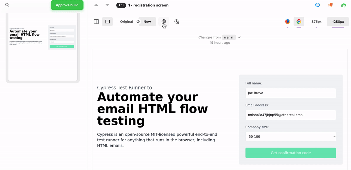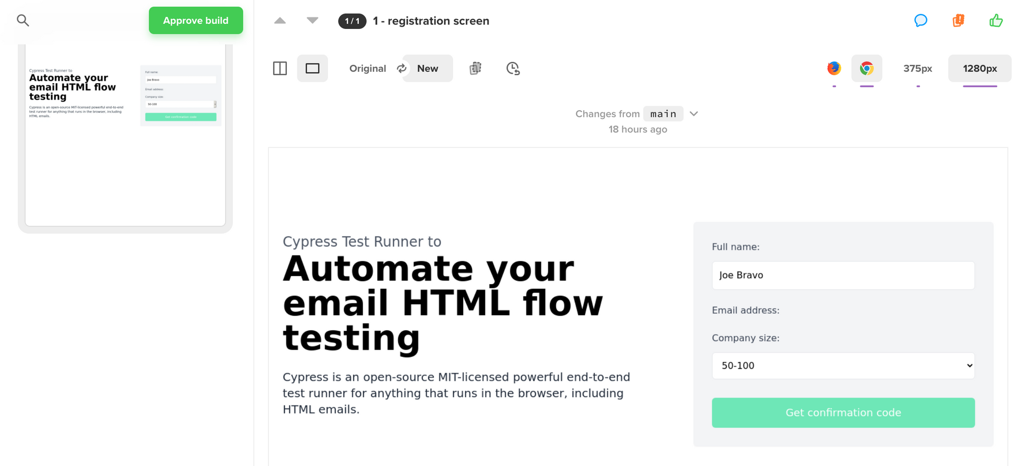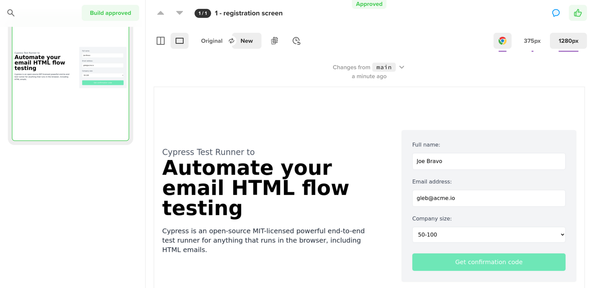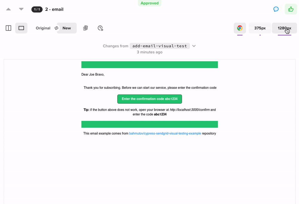 The email still works the same after our text changes, because the functional Cypress test confirms it. Let's make sure the confirmation screen is tested visually too.