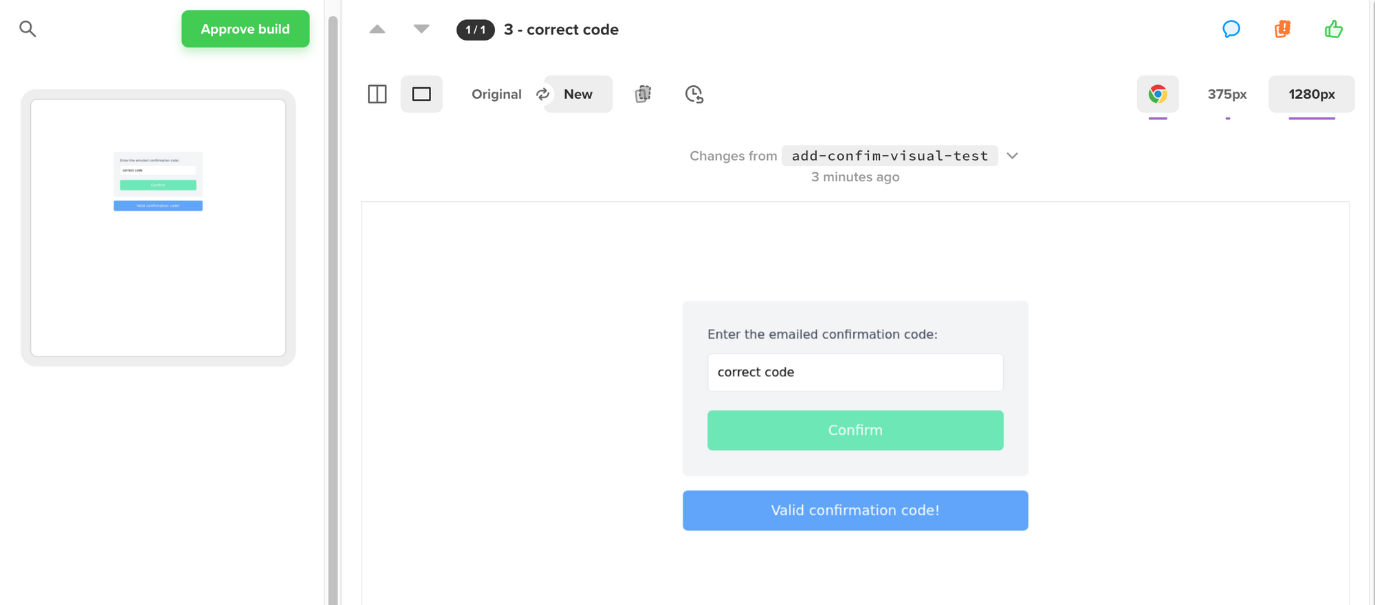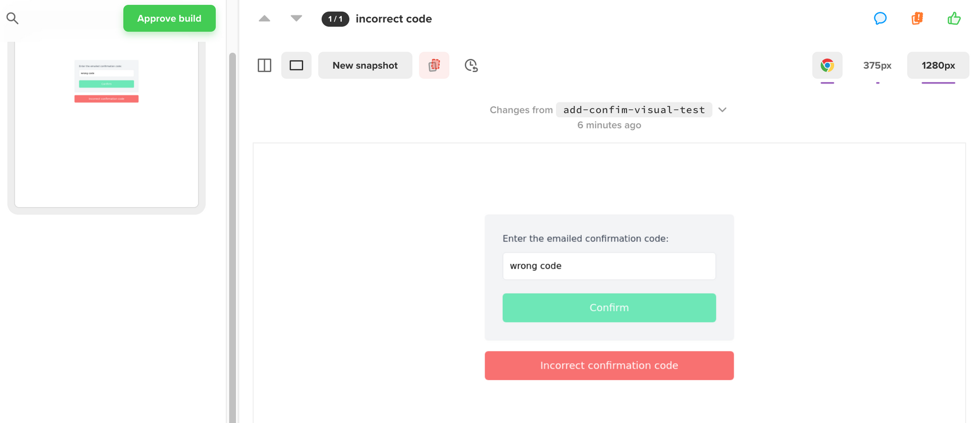 The localhost:3000/confirm is the page where the user enters the confirmation code. Our test verifies that the code is correct. We can add a visual assertion to the test, but after changing the dynamic data in the input field to a constant.