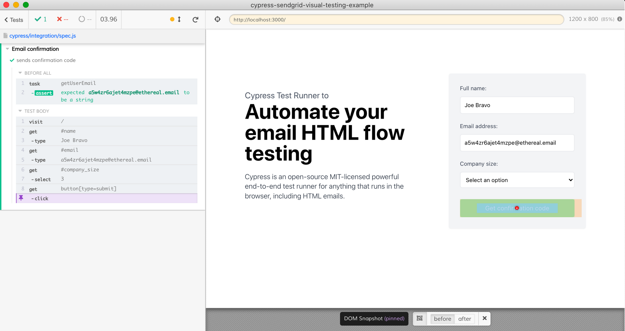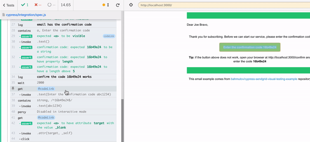 cy.percySnapshot('2 - email')Time-traveling debugger helps us confirm the test changes the dynamic text in two elements correctly.