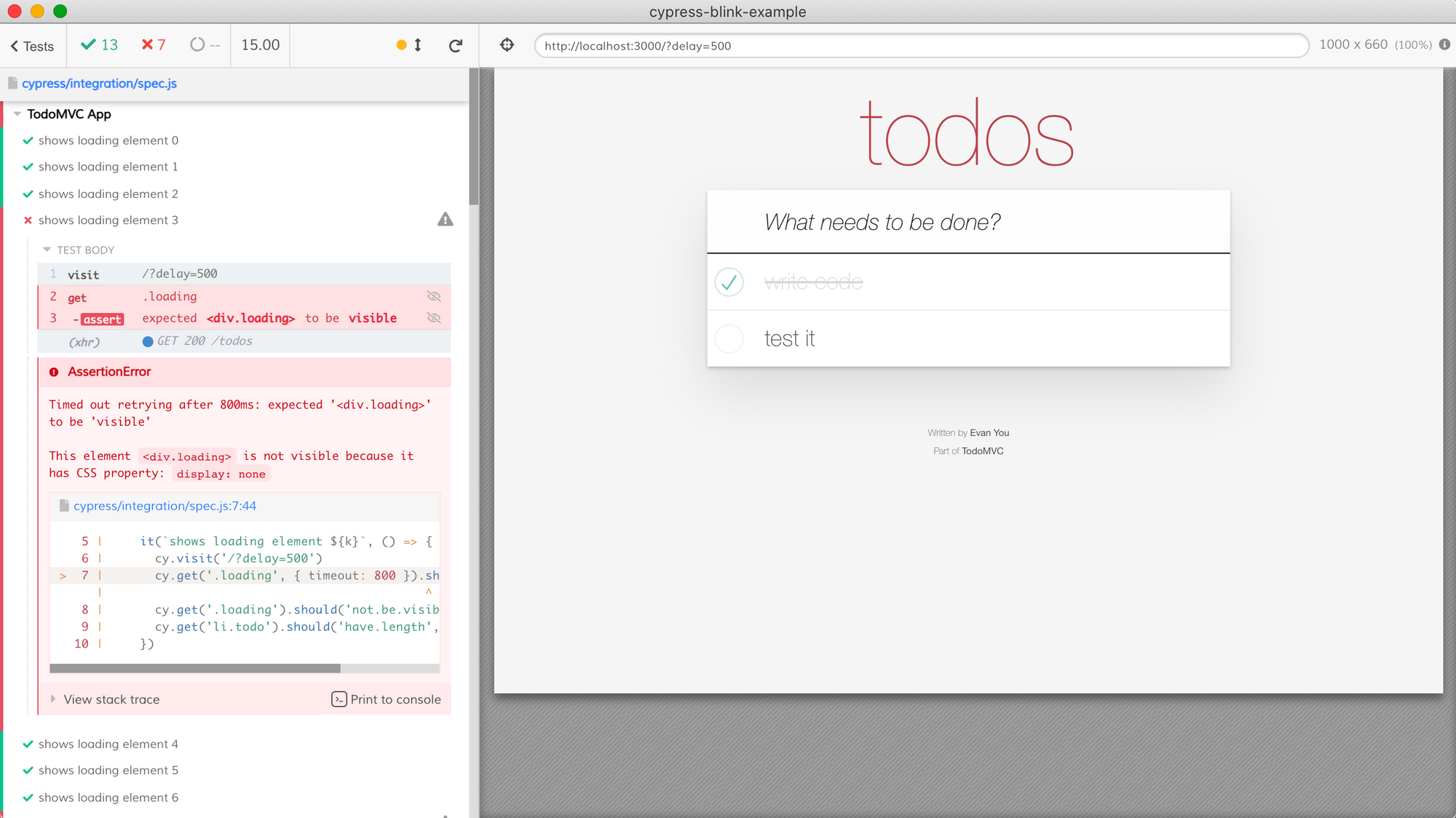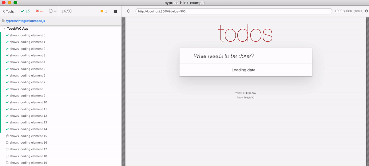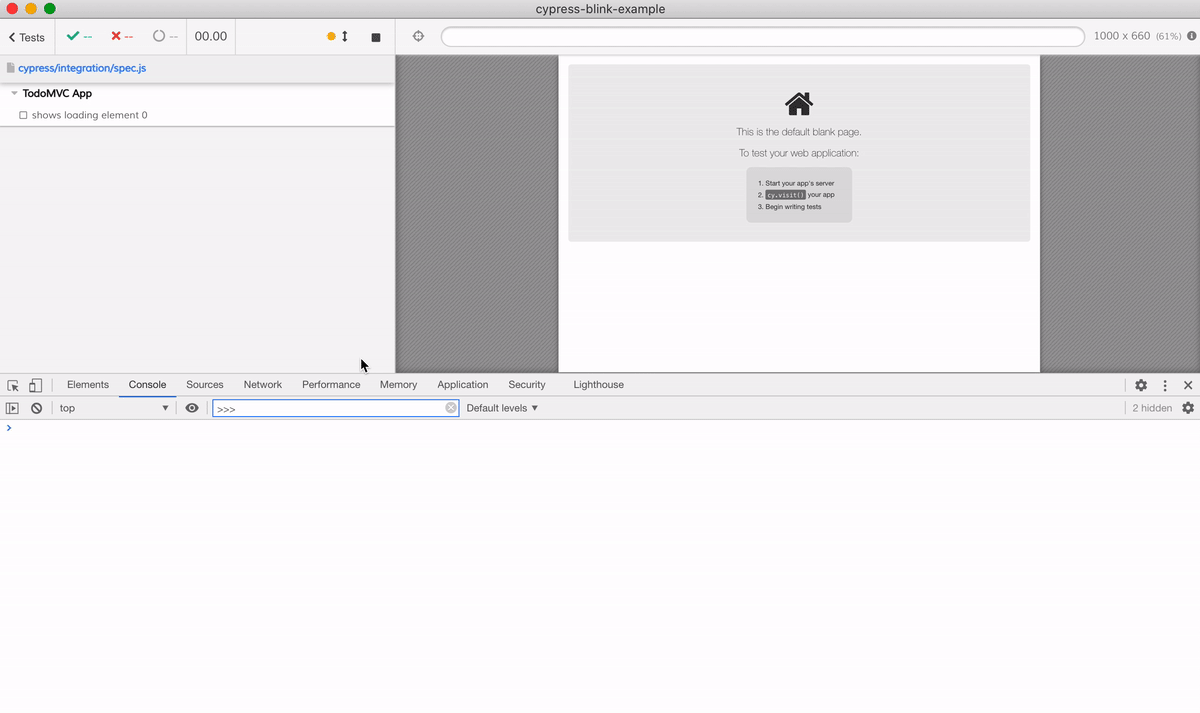 })The test above first uses the positive assertion .should('be.visible') to establish the element is displayed, then the negative assertion .should('not.be.visible') to make sure the element goes away. We need the positive assertion first to make sure the test does not pass before the application starts data load. For more on negative assertions read the blog post Be Careful With Negative Assertions.