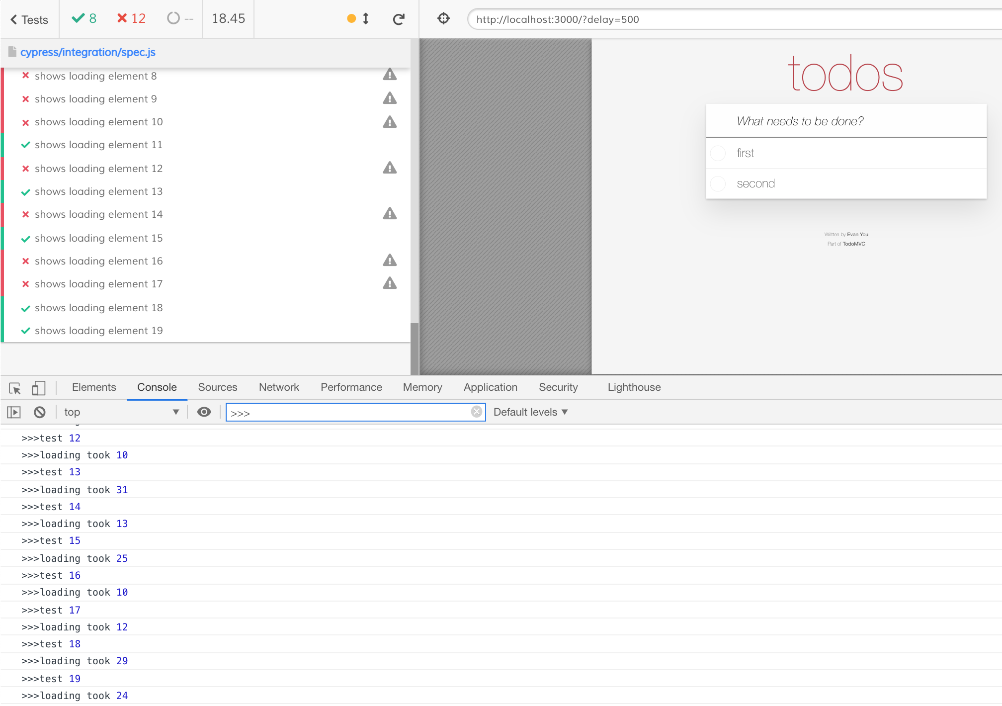 If we observe a passing test we can see the loading element appearing and disappearing very quickly. Let us time how long it takes to fetch JSON data from the server. I will modify the application's code, and the elapsed time will be printed in the console.