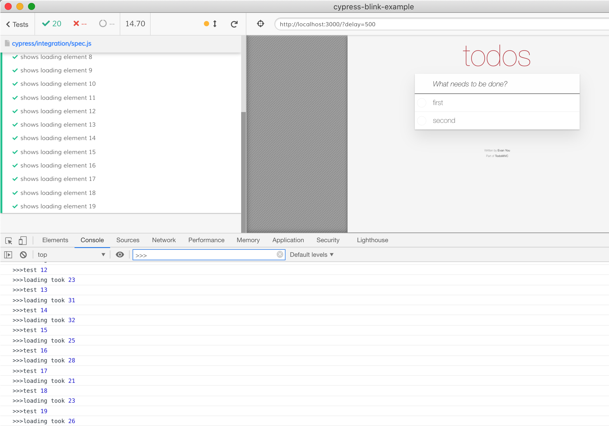 })Let's run the test - we can filter the console logs using ">>>" string to show the test index and the loading duration messages only.